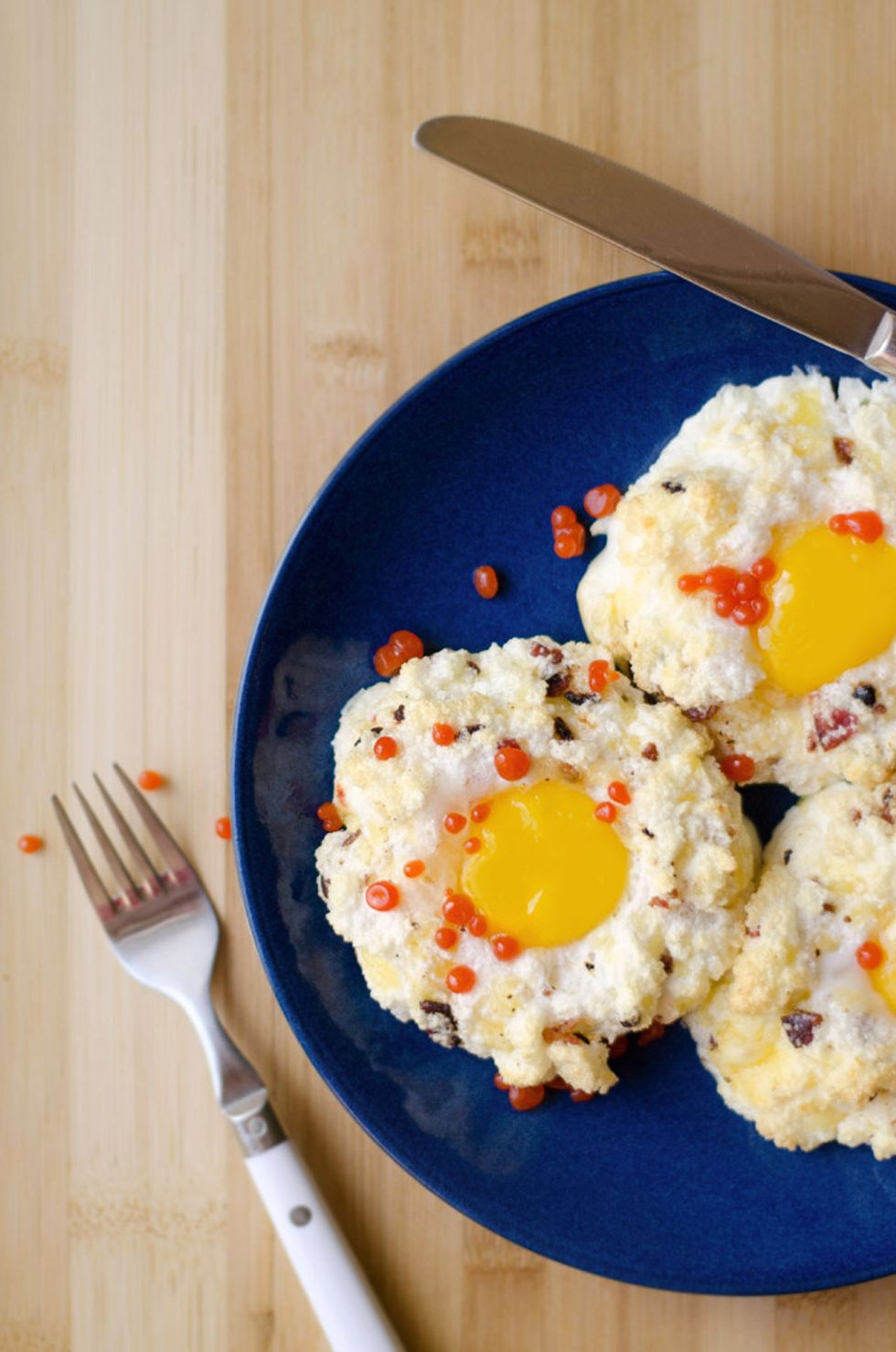 Eggs in clouds with bacon, pepperjack, and sriracha pearls.