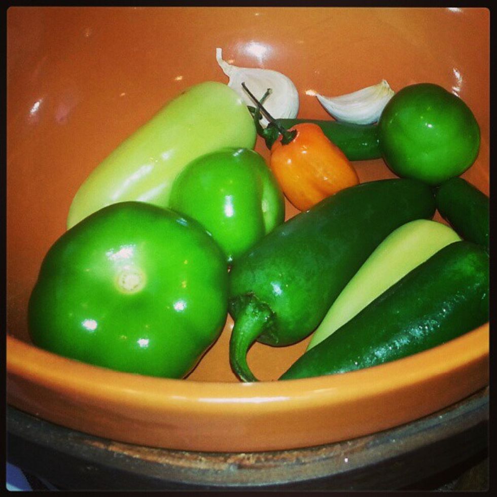 After roasting fresh peppers, garlic, and tomatillos on grill or stove top. Peel skin and place in blender with garlic, canned tomatoes and sauce. Add salt to taste.
