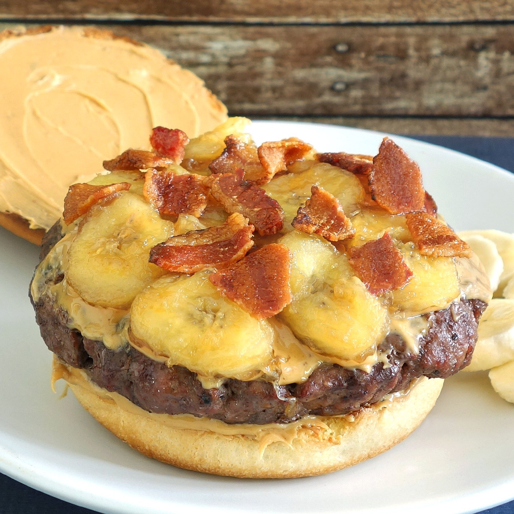 The Elvis burger is topped off with fried bananas, peanut butter, & bacon in honor of the late, great hip gyrator Elvis.