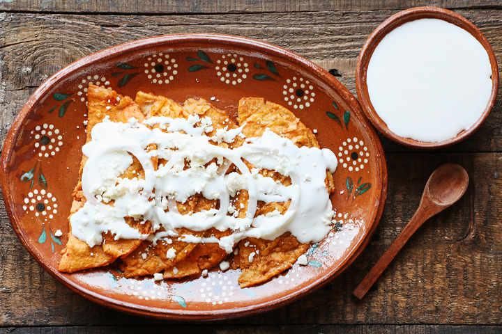 San Luis Potosí style enchiladas prepared by dipping the tortillas in a guajillo chile sauce then cooked with in a few spoonfuls of a chile sauce prepared with ancho, chile, serrano chile, green tomato, and tomato.