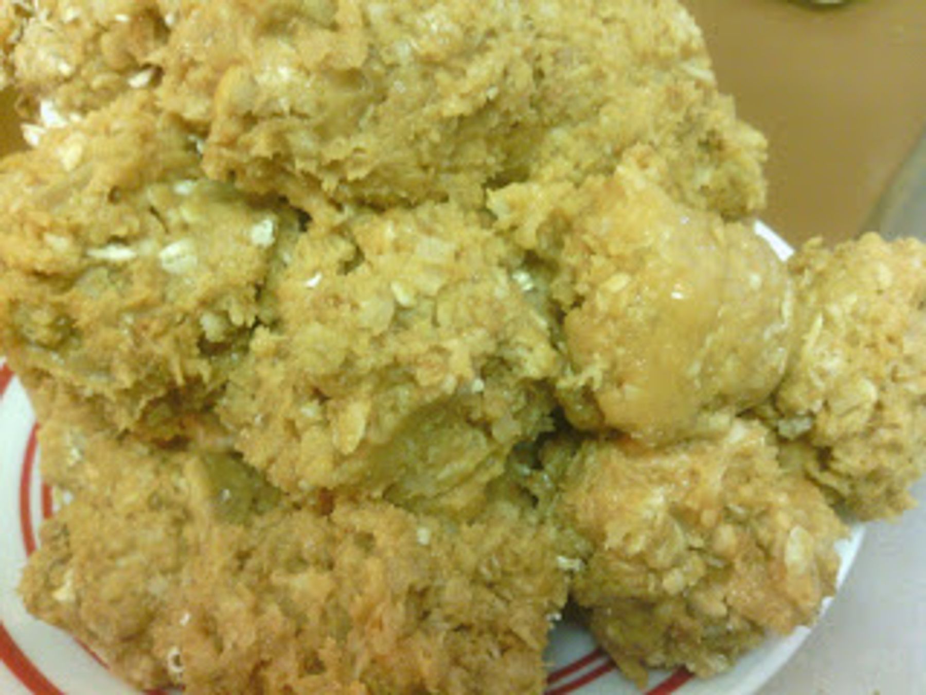 Warm up the honey. Mix all ingredients together and place bowl in fridge for about an hour. Mold dough into balls. Store in the fridge.