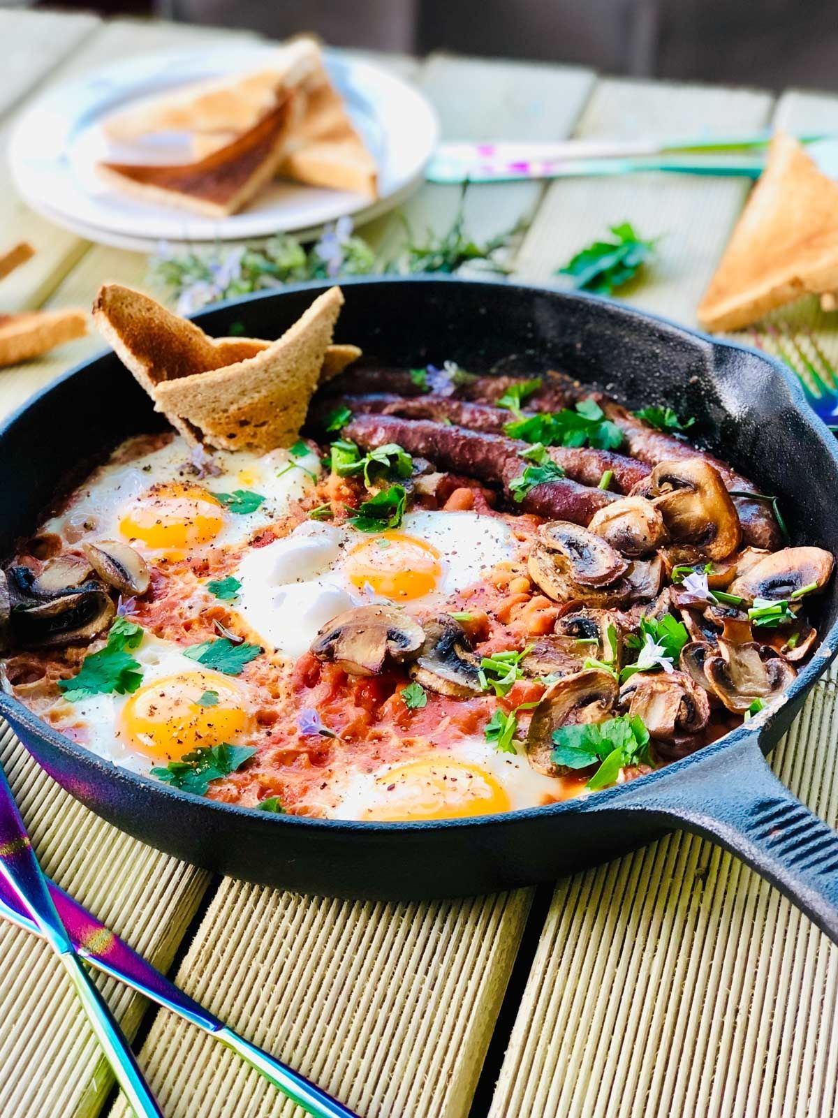 One pot English breakfast you said? Oohh yeass! All your favourite breakfast ingredients (eggs, sausages, baked beans and mushrooms or bacon- all in one place, no mess no fuss. Just delicious!