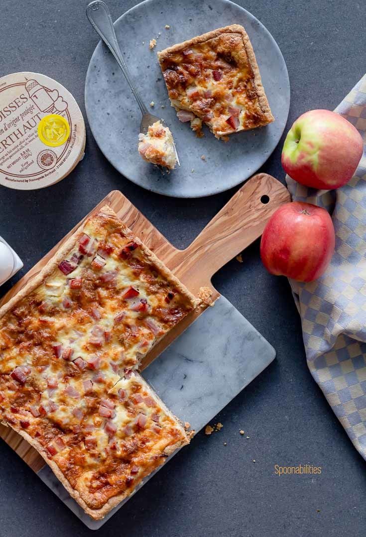 Époisses Ham Apple Tart has a flaky crust with a rich savory custard filling made with eggs, salty deli ham, heavy cream, pink lady apples and the most delicious French cheese Époisses.