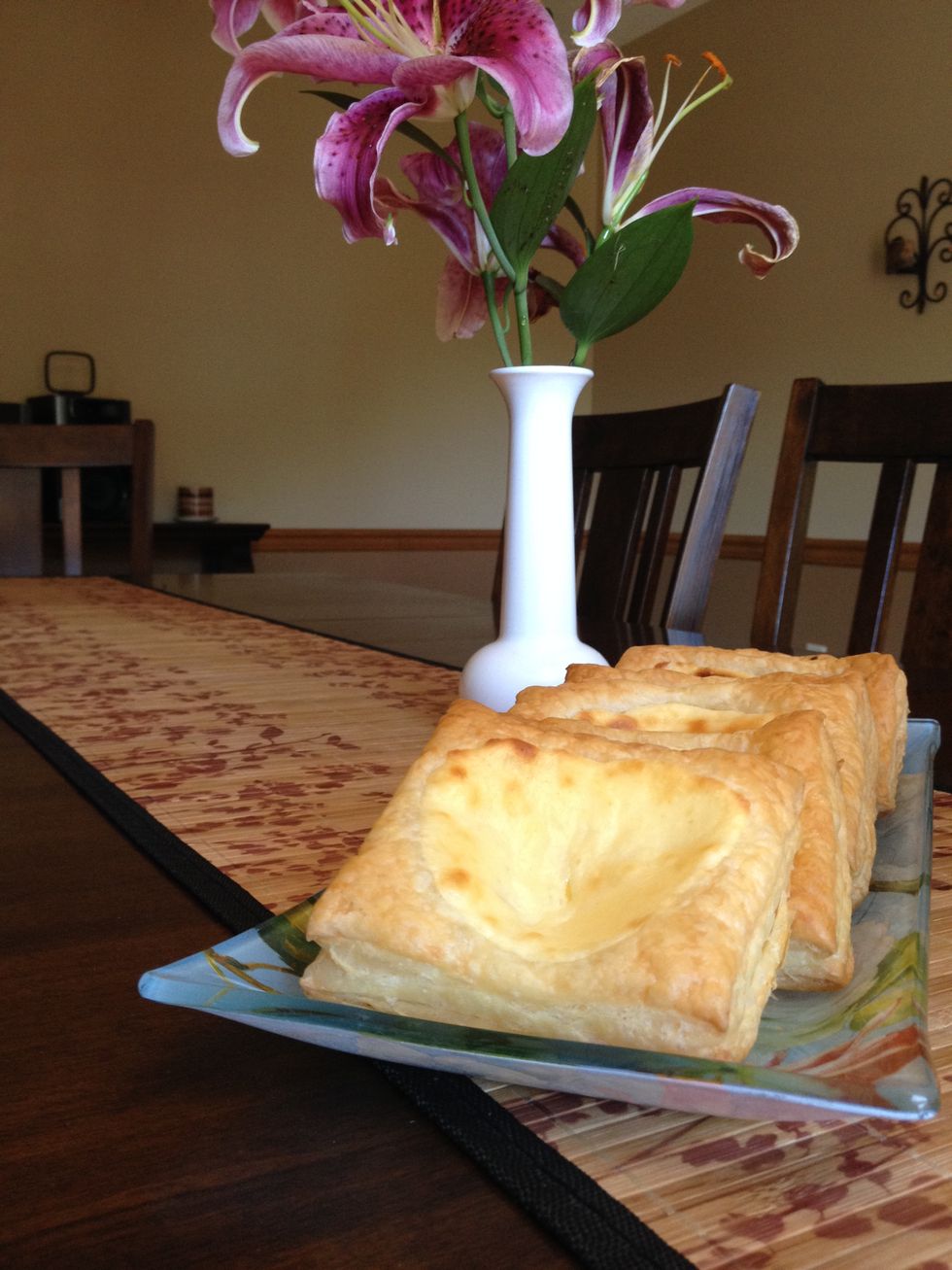 4. Add 1-2 tbsp of cream cheese fililng into the center of the puff pastry pieces.