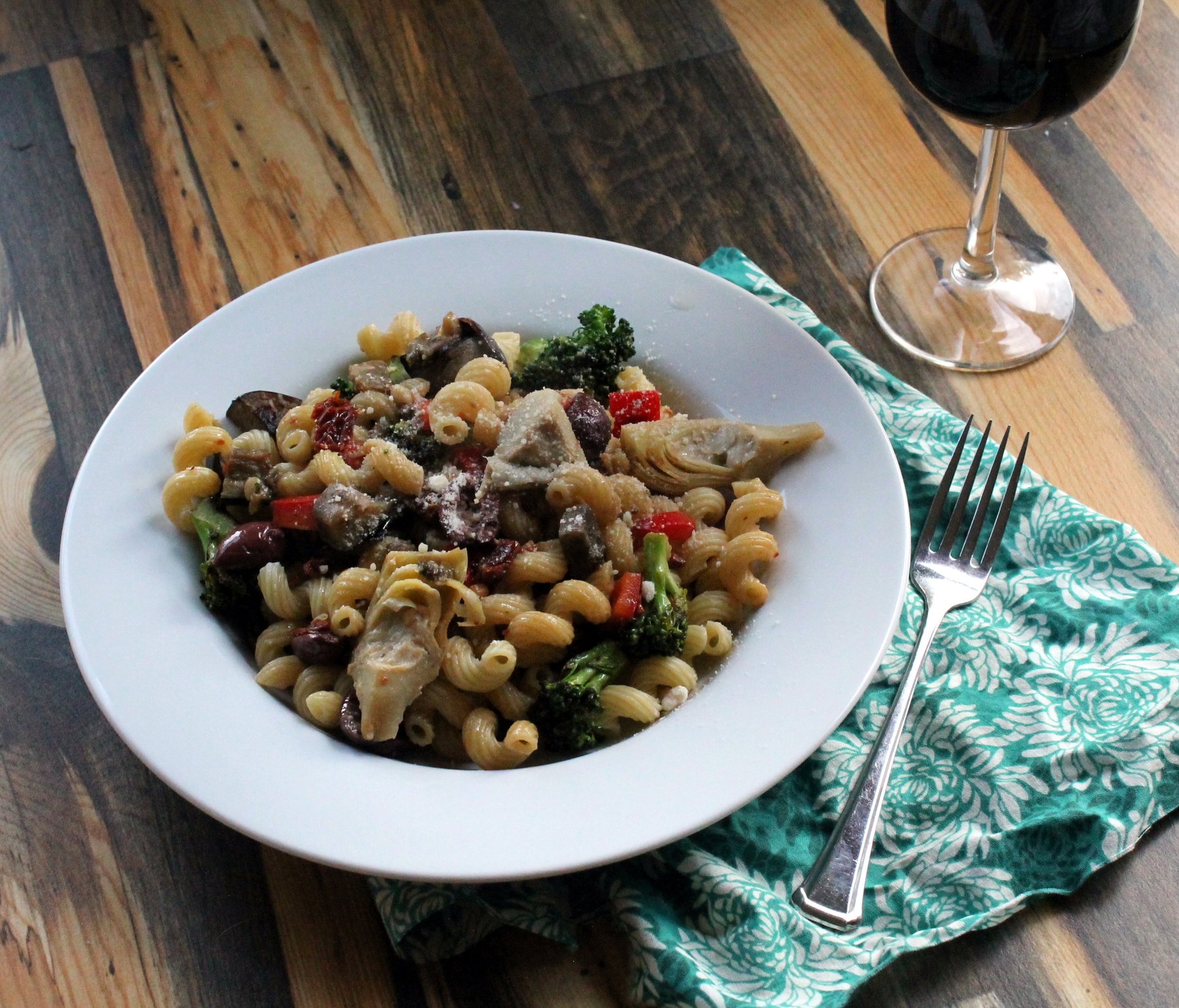 Prepare the pasta according to package instructions and set aside. In a large thick bottomed skillet heat the oil over medium high heat add the garlic and cook for one minute. Add eggplant, broccoli,...