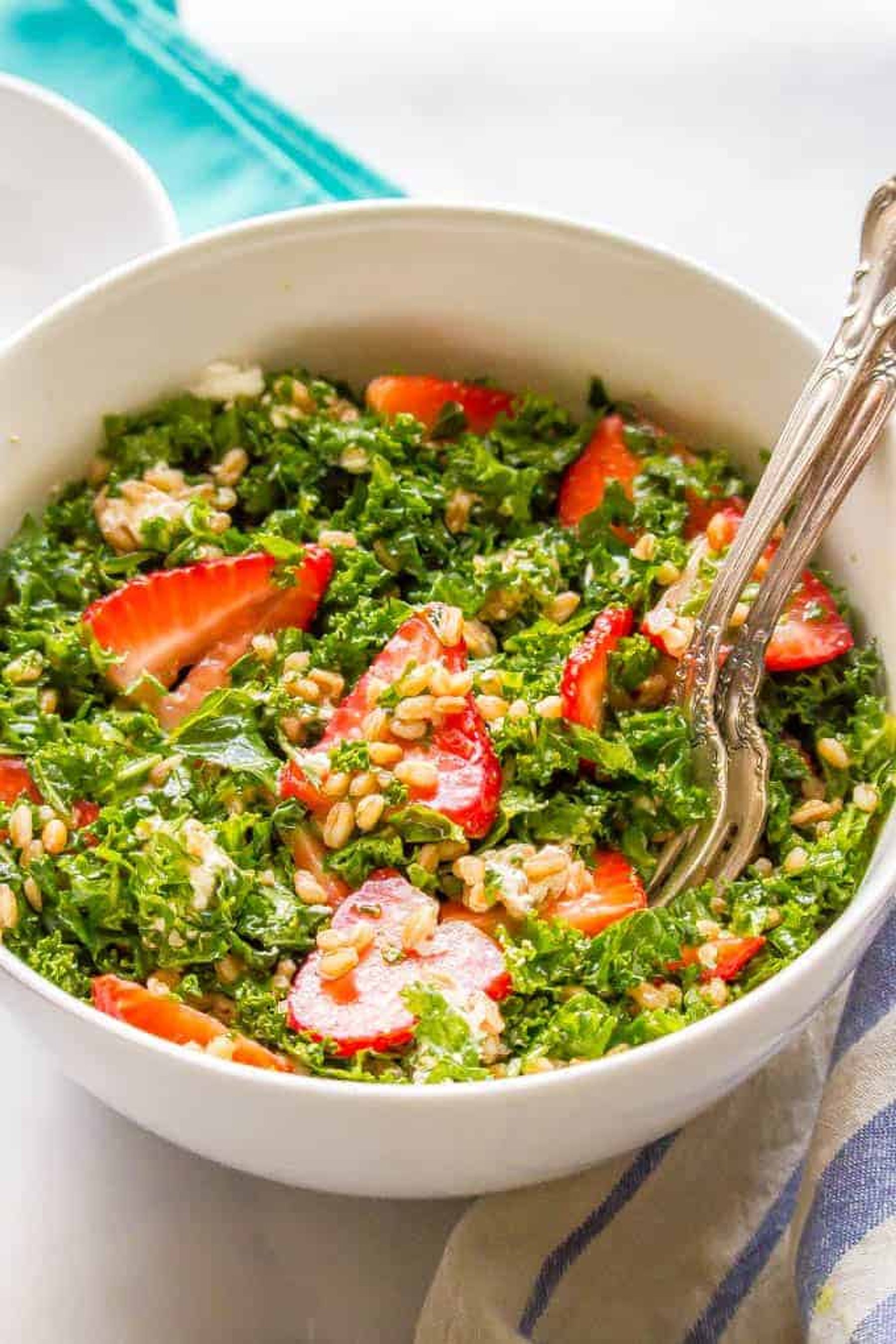 Farro, kale and strawberry salad with goat cheese is a delicious combination with bright, fresh flavors and tons of great texture. It’s perfect for a light lunch or as a side salad with dinner.