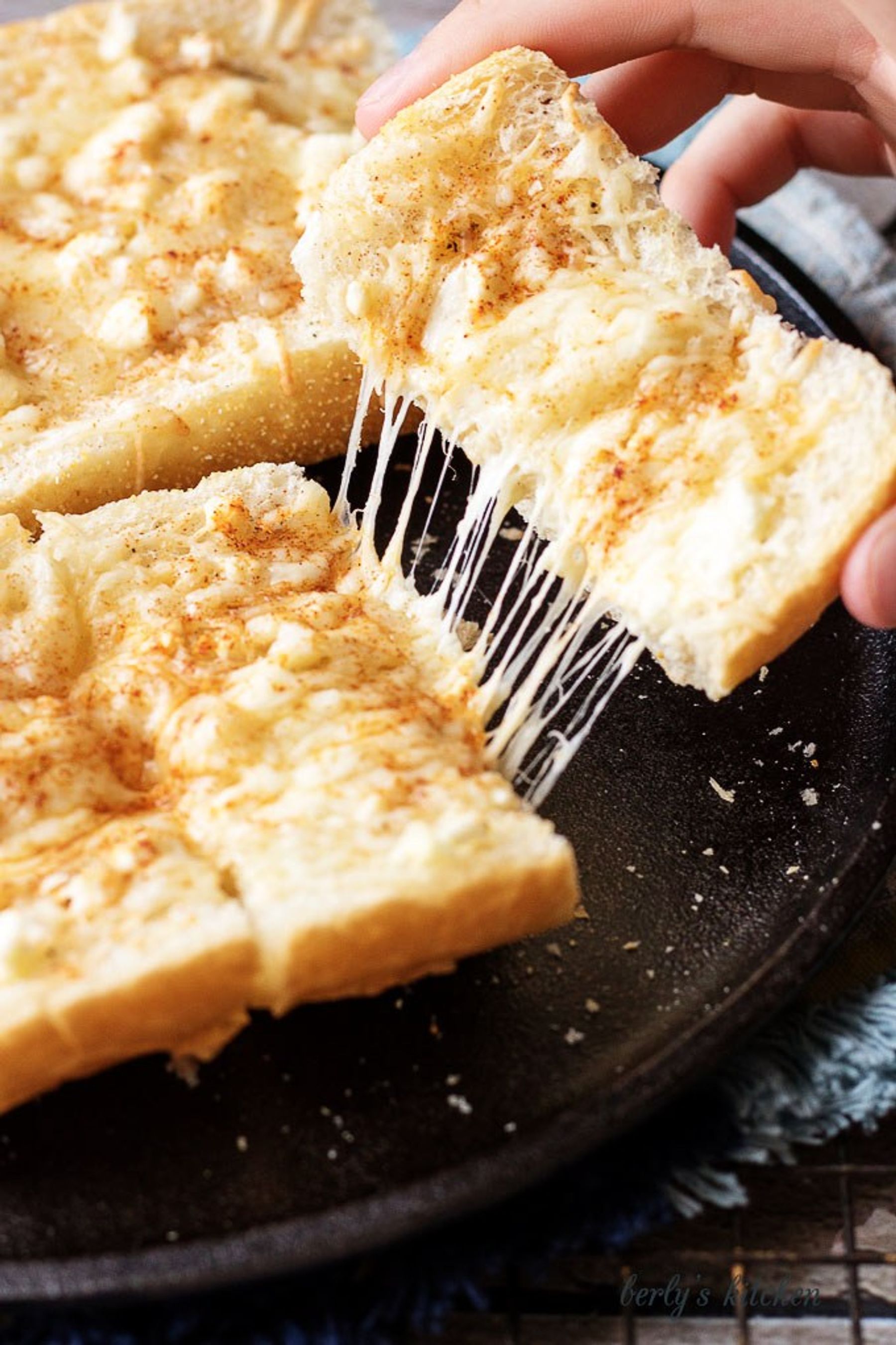 Feta mozzarella topped cheesy bread is the ultimate compliment or starter to any meal. We took Cuban bread, topped it with feta, mozzarella, and garlic.
