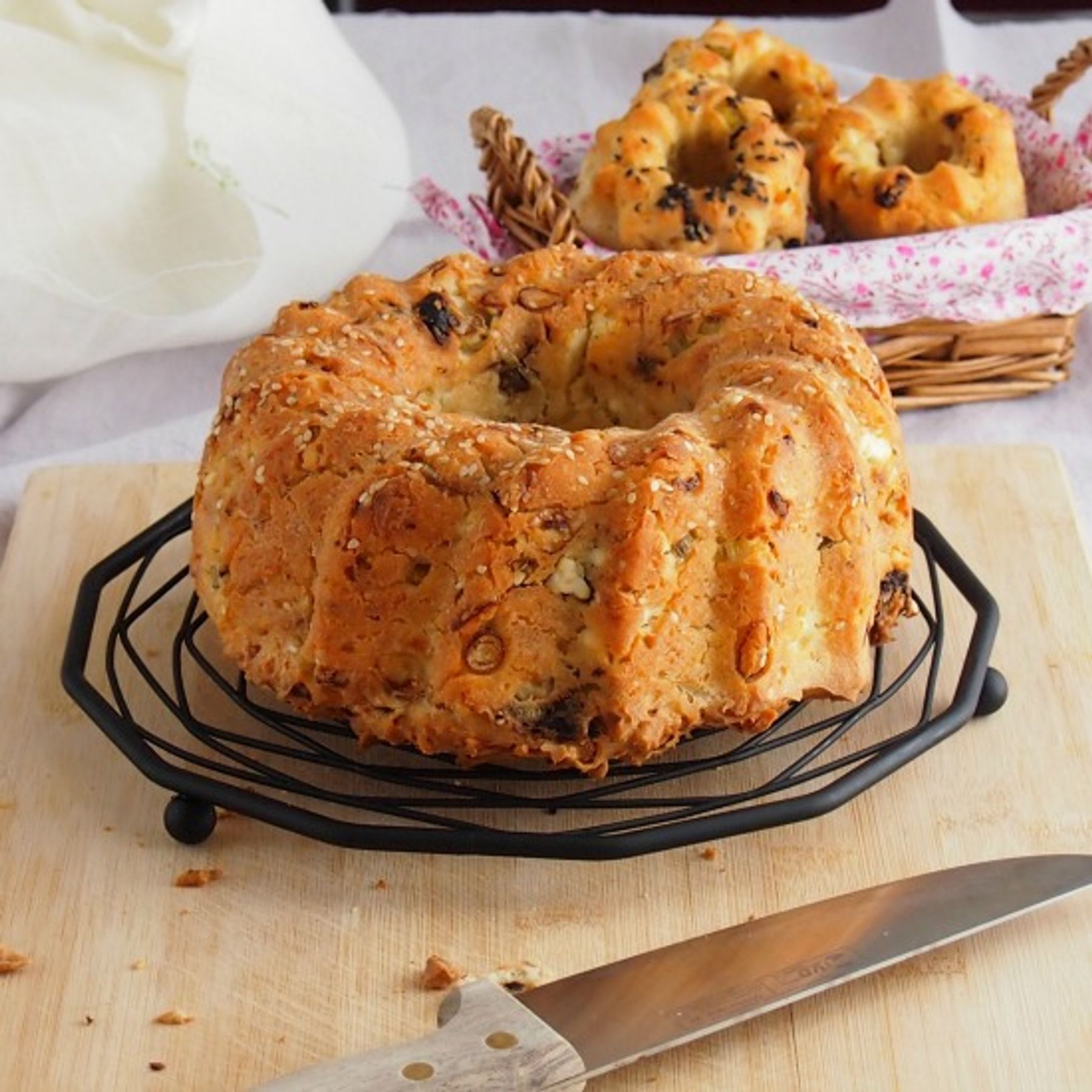I lovely savoury cake with feta cheese, sundried tomatoes, fresh herbs and spring onions. It is great for breakfast or brunch but also for a buffet or a picnic.