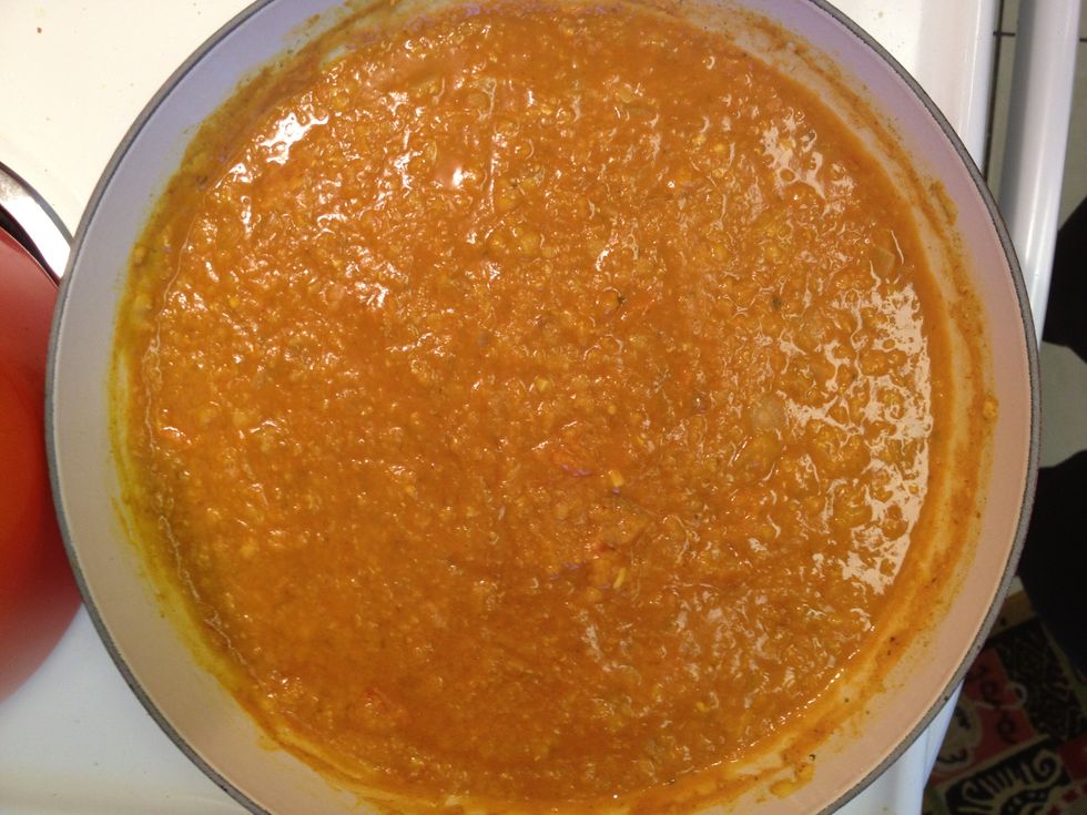 Stirring frequently, add the broth, lentils, peppers, and spices. Bring to a low boil, then turn down the heat to low, cover and let the soup simmer for about 20 minutes, or until lentils are very tender.