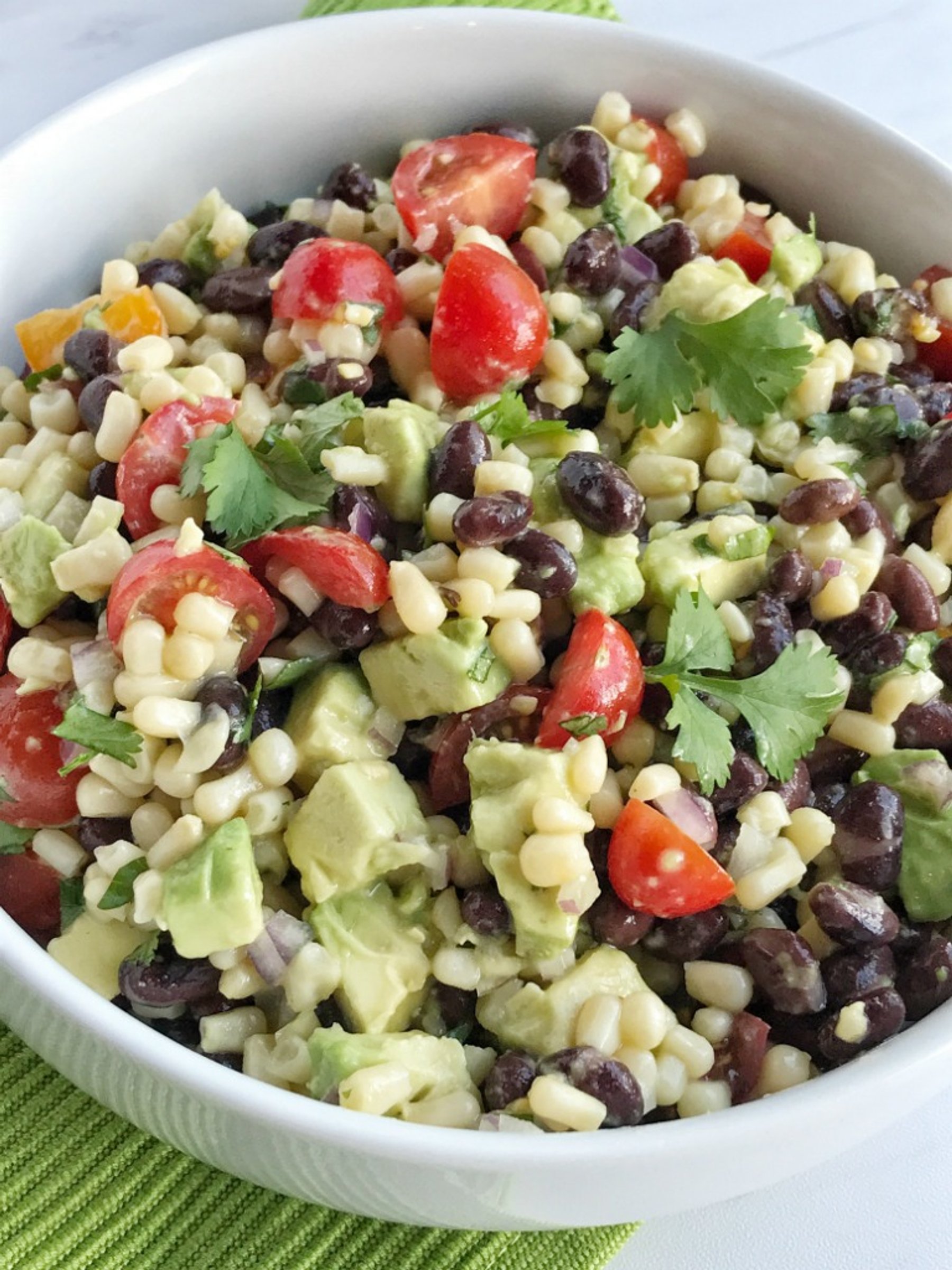 Fiesta avocado salad is loaded with avocados, corn, black beans, tomatoes, red onion, and cilantro covered in an easy citrus & olive oil dressing. This is the perfect side dish to any Mexican dinner, topping for tacos, nachos, inside burritos, or as a dip with tortilla chips.