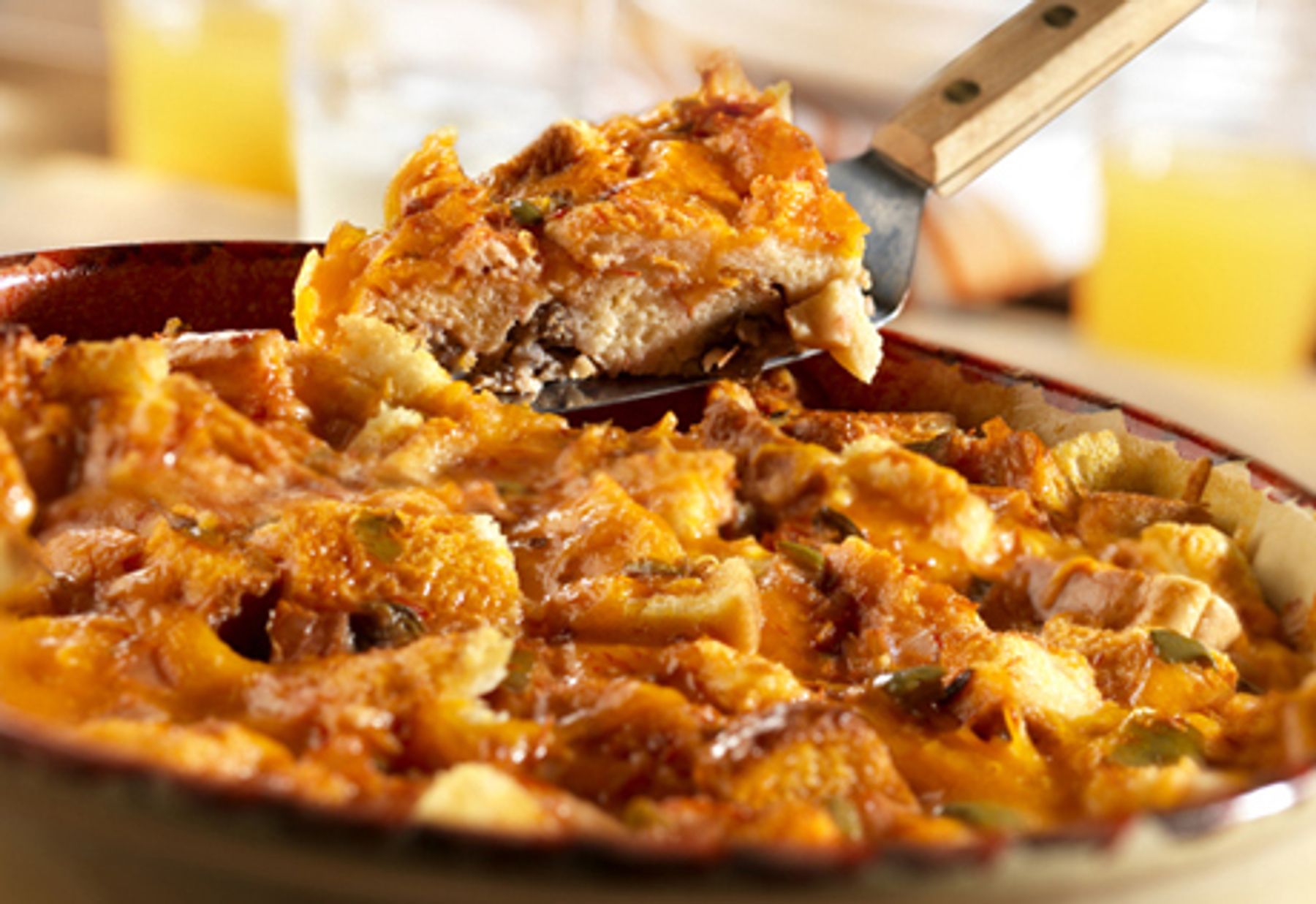 Spoon the sausage into an 11 x 7 x 2-inch baking dish. Top with the bread cubes and cheese. Beat the picante sauce, eggs and milk in a medium bowl with a fork or whisk. Pour the picante sauce mixture over the bread mixture. Stir and press the bread mixture into the picante sauce mixture to coat. Cover and refrigerate for 2 hours or overnight.