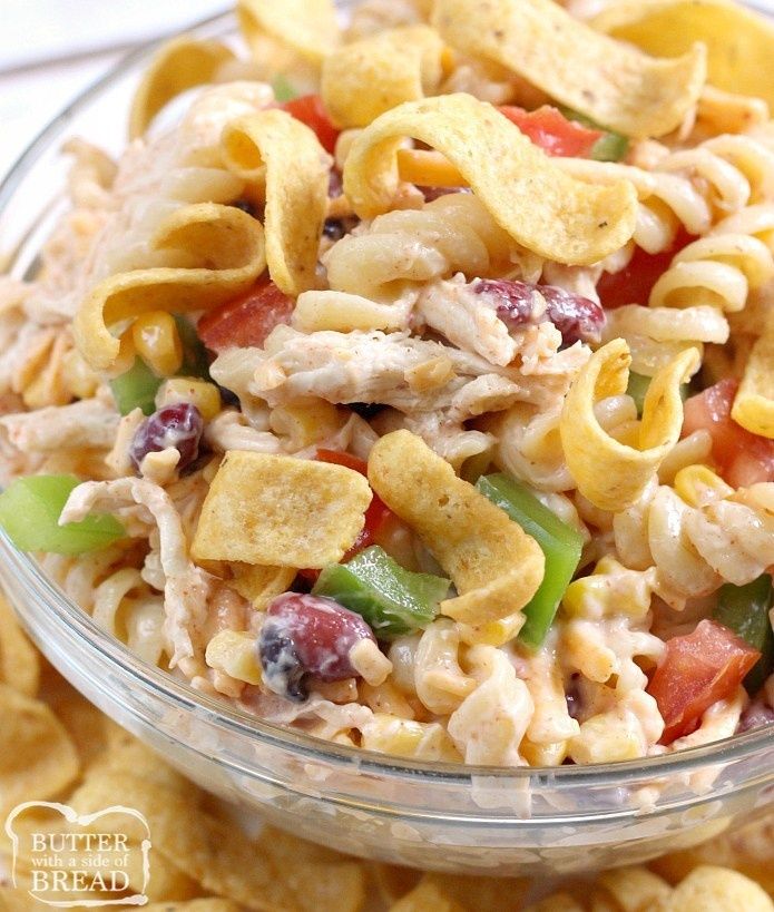 Fiesta Ranch Chicken Pasta Salad is full of fresh southwestern flavors with black beans, corn, cheese and tomatoes. This hearty chicken pasta salad recipe topped with Fritos is perfect as a main dish or a side dish for potlucks and parties!