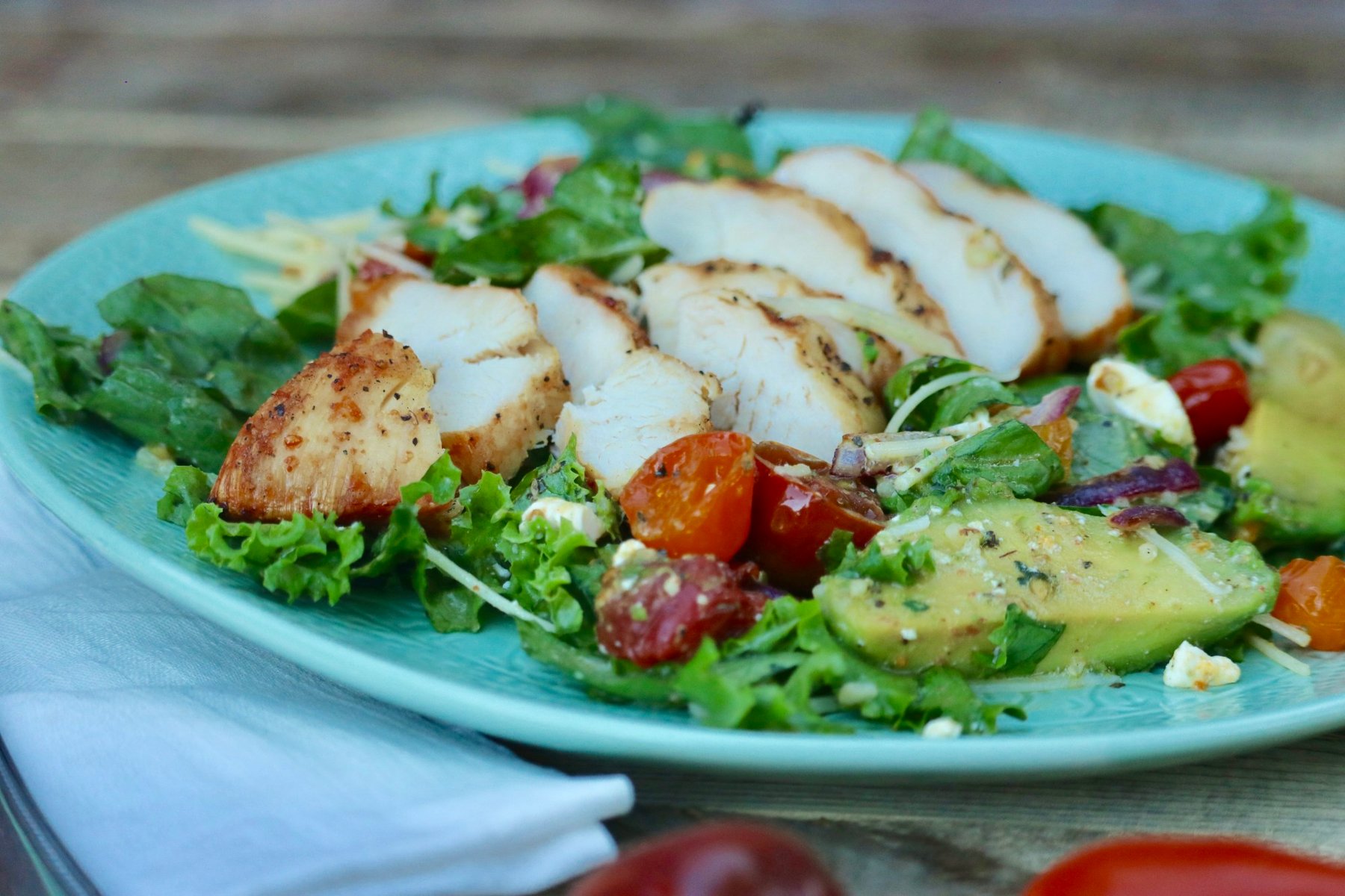 This salad has so much flavor happening, you don’t know where to start. Smoky fire licked rainbow cherry tomatoes, red onion, creamy avocado slices, tender grilled chicken tossed with a homemade lemon-herb balsamic vinaigrette and a fresh bed of greens.