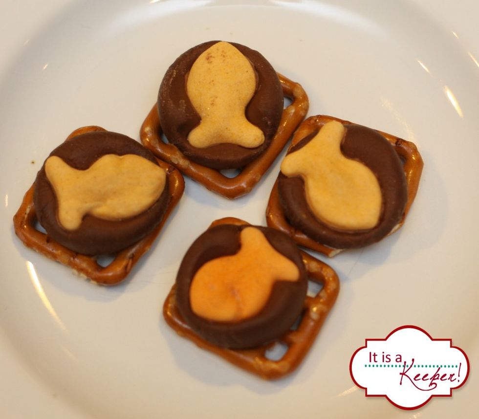 On a parchment lined baking sheet, lay out your checkerboard pretzels. Top each pretzel with a Hershey Kiss. Bake at 250 degrees for 5-10 minutes – you just want to soften the chocolate. Remove from over...