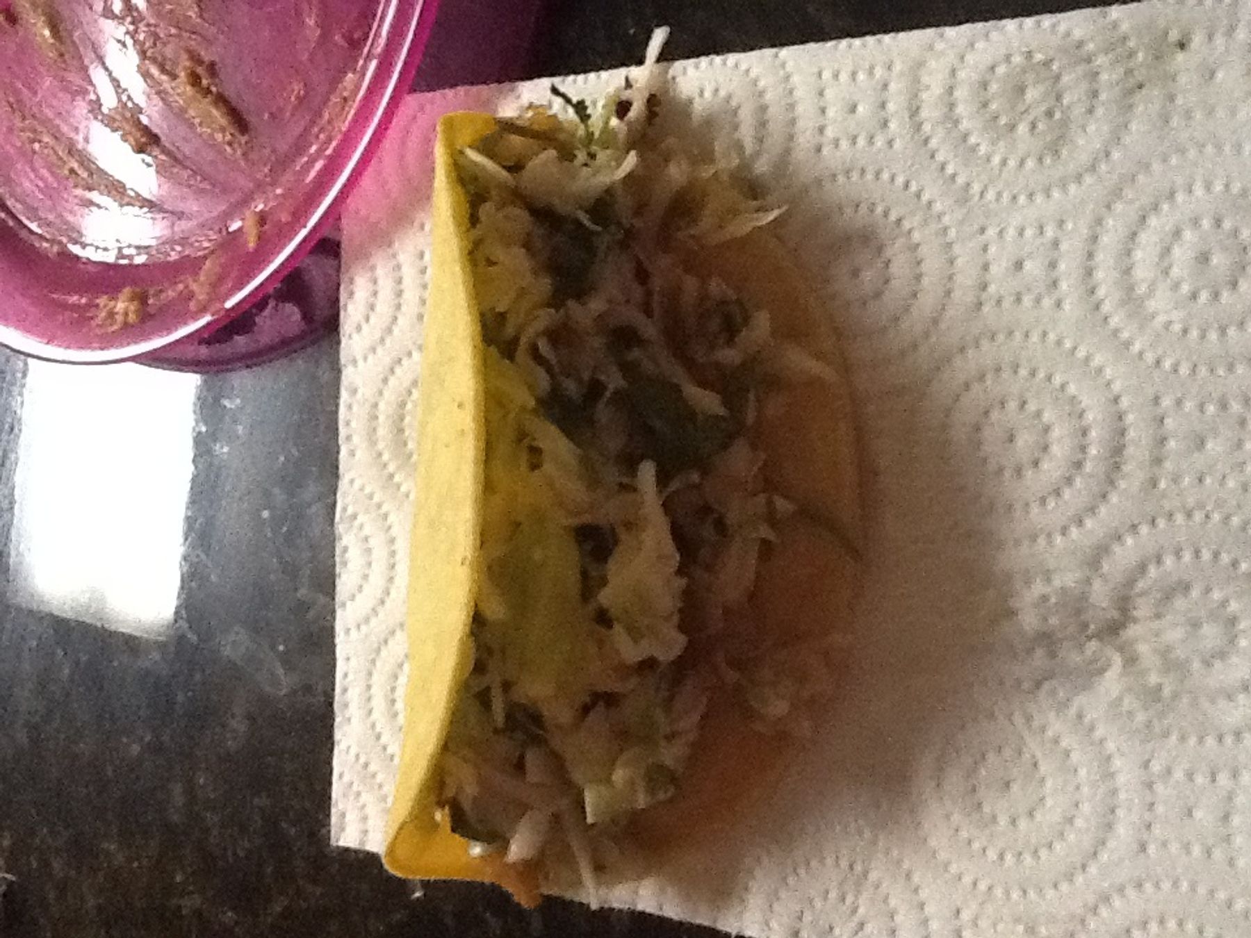 I open the slaw mix and put it in a bowl then I chop up half a bundle of cilantro. Then I coat the slaw mixture with vinegar, zest and juice of one lime, sprinkle of red pepper flake add a little or a lot for your spicy level, sugar to balance anywhere from 1Tb to 4Tb, sprinkle garlic powder. You can adjust all of these ingredients to suit your taste. The slaw should be slightly spicy, tangy, with a hint of sweetness. You can make this the night before to let the flavors combine or at least an hour before.