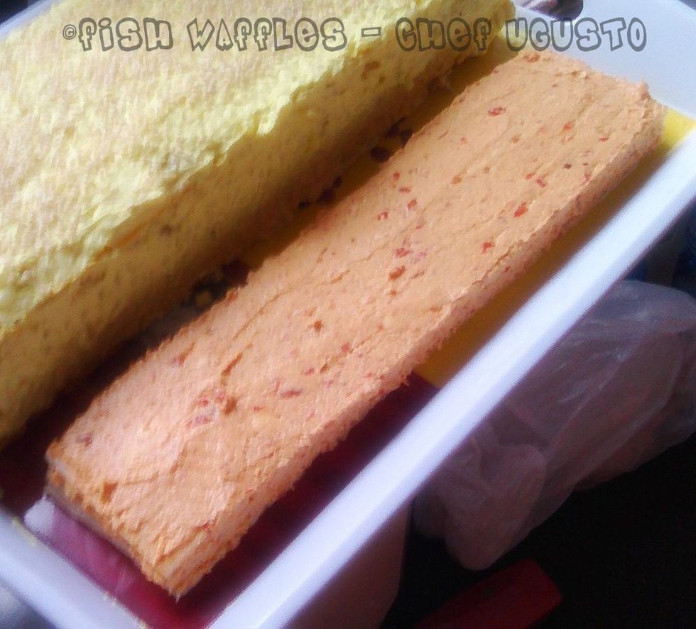 4. Let the waffle sit into the fridge for 3-4 hours before serving and cut into pieces at your convenience. If you wish, you can decorate with some fish paste or mayo.