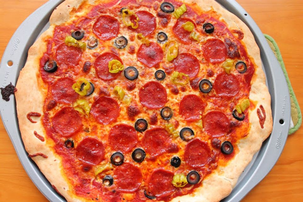 Preheat oven to 375°. Mix together all the dry ingredients and then add the water and shape into dough on pizza pan, top with sauce and desired toppings. Bake 20-25 minutes.
