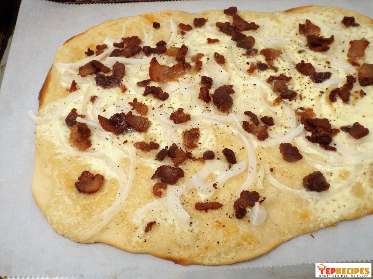 A German/French style thin crust pizza also known as "Tarte Flambée" that's topped with crème fraîche, onions, and pork belly.
