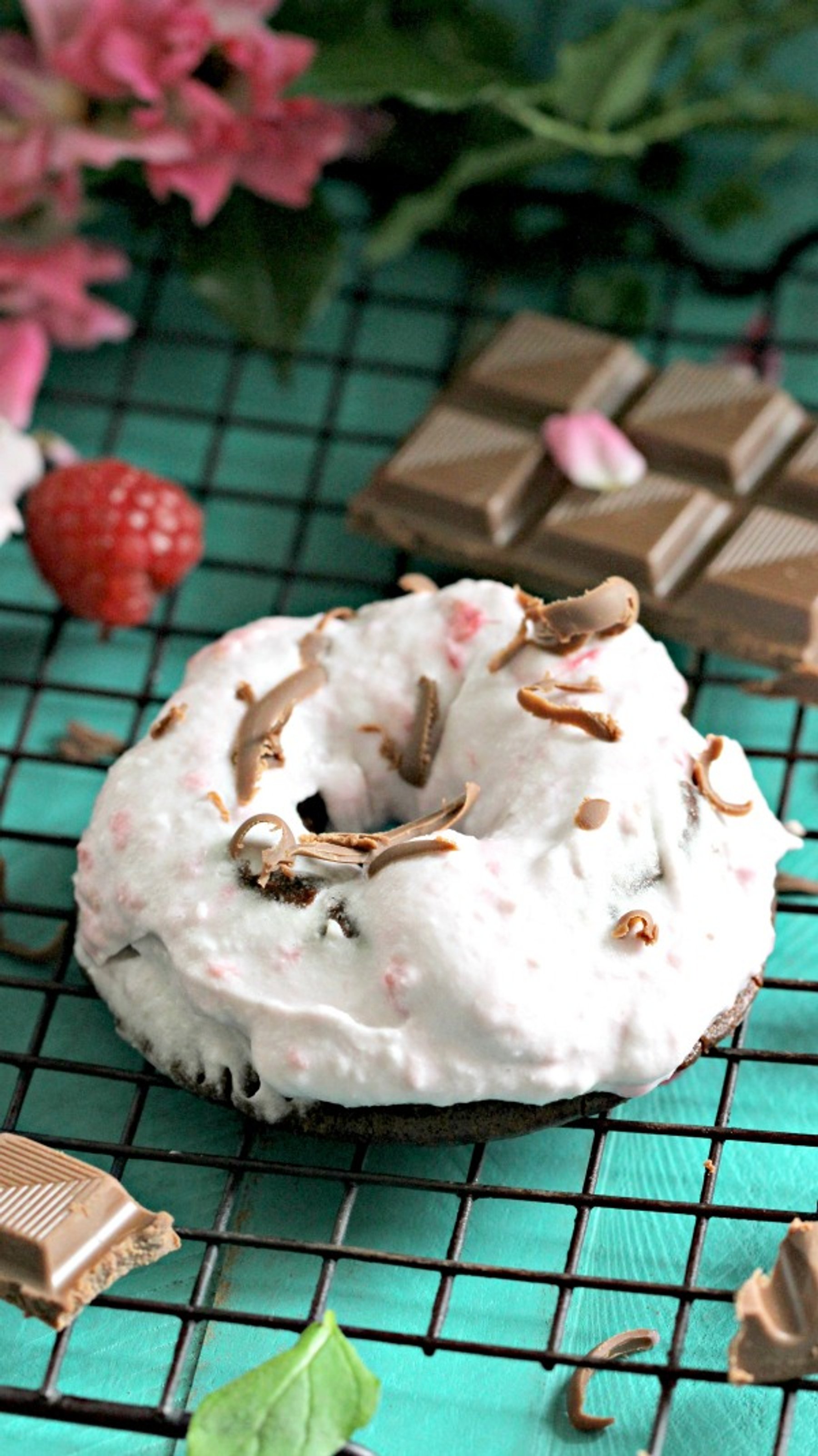 Decadent flourless chocolate cake baked donuts made with 3 ingredients only and topped with raspberry coconut cream whipped cream.