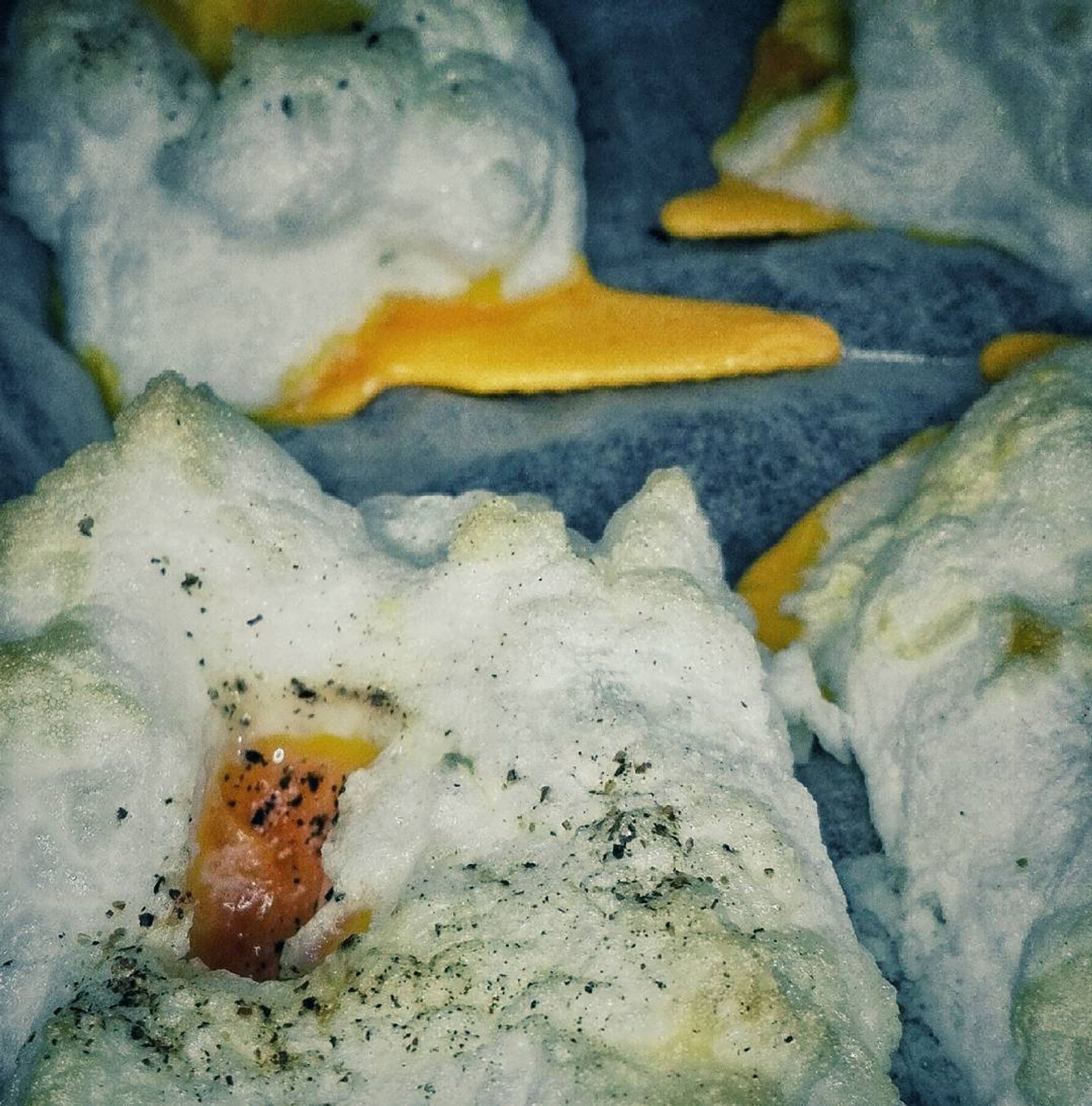Separate the egg yolks from the whites and put every yolk in a different plate, tryin to keep the yolk intact. Put the whites in a Bowl and whisk em until stiff. Cover a baking tin with baking paper and...