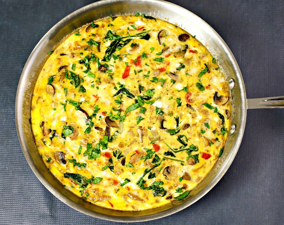 A healthy Fluffy Frittata slow baked in the oven. It is packed with savory chicken sausage and a colorful, fresh vegetable medley!