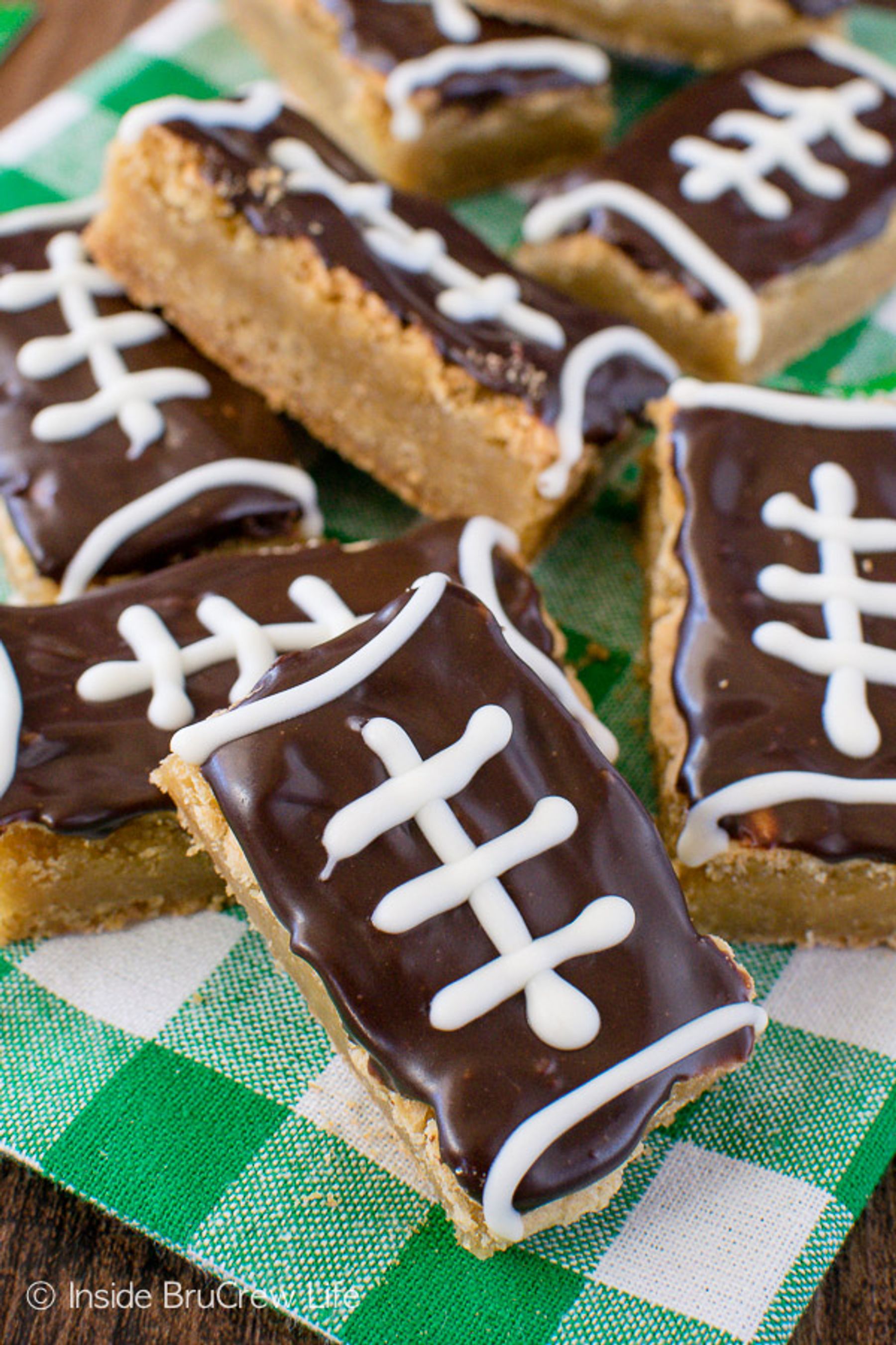 These chewy and chocolate covered Football Cookie Bars are a fun treat to share at game day parties or sports themed birthday parties.