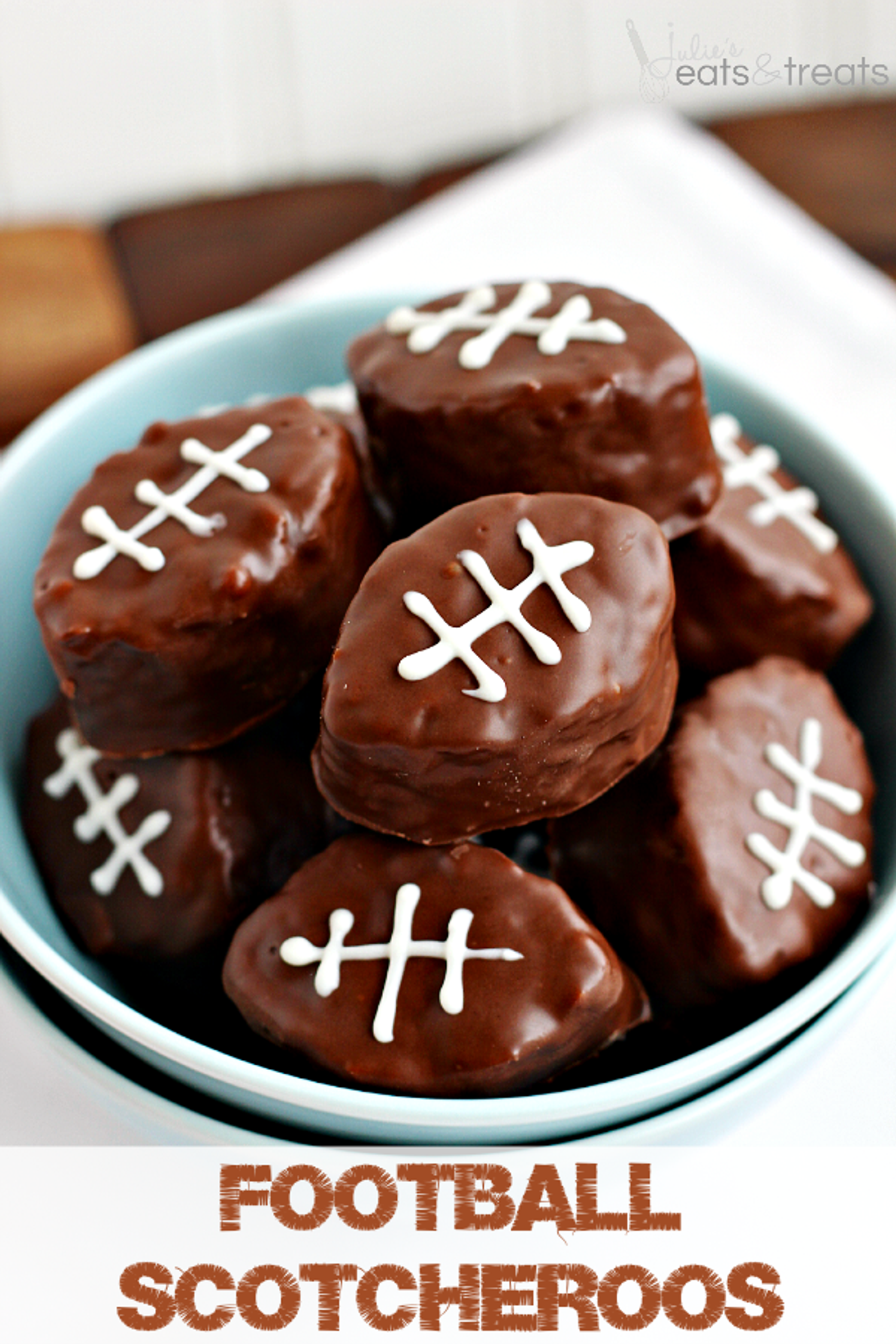 Football Scotcheroos ~ Festive treats for the big game! Ooey, Gooey Scotcheroos covered in chocolate!