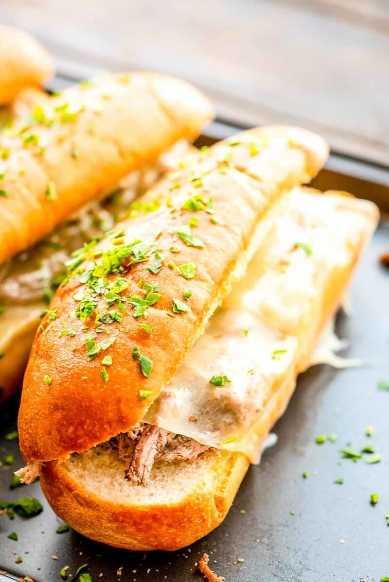 French Dip Sandwiches are a delicious and easy dinner when you are busy! The roast beef is slow cooked all day in your crock pot so it's falling apart tender when you pile it high in your toasted hoagie roll with melted provolone cheese. Don't forget to dunk it in the salty au jus to finish it off.