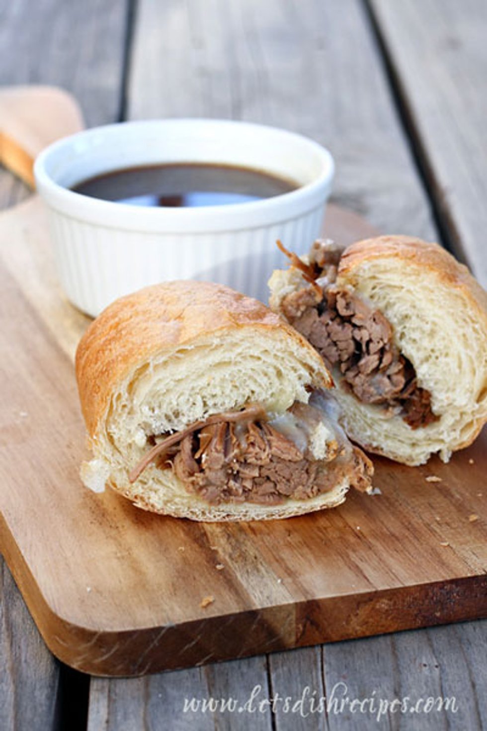 Season roast with salt and pepper and place in slow cooker. In a medium bowl, combine onion soup mix, au jus mix and beef broth. Pour over roast. Cook on low for 8-10 hours, or on high for 5-7 hours. Remove...