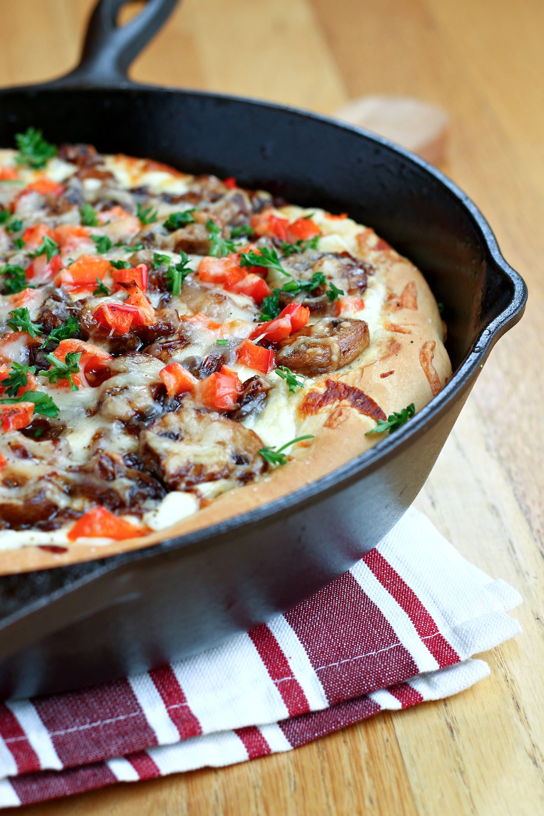This unique and delicious pizza features caramelized onions with balsamic vinegar, along with sauteed mushrooms, atop a French onion "sauce."