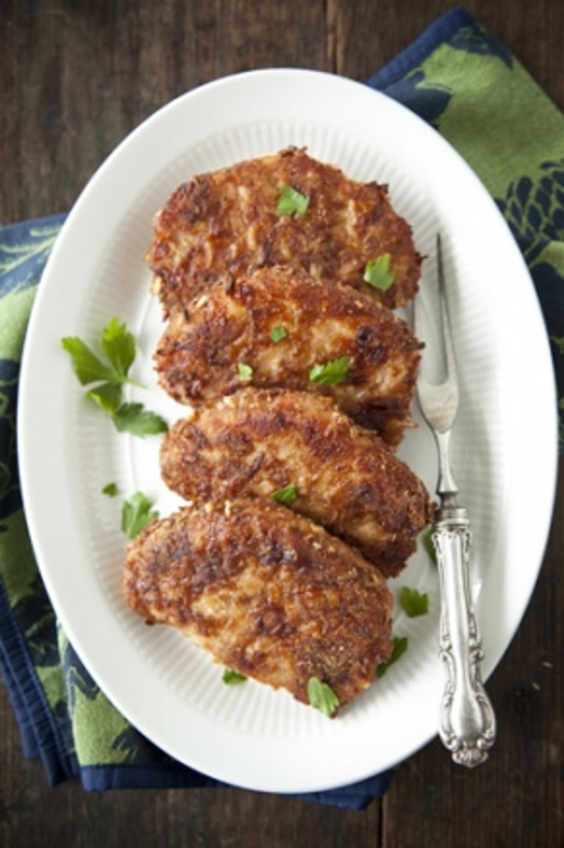 Coat the pork chops with the beaten egg, and then with the breadcrumb mixture; take care to coat both sides.