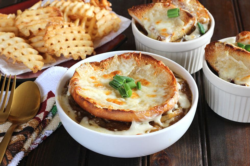 French onion soup is a rich and classic soup prepared using melt in mouth caramelized onions and topped with cheesy and crunchy bread slices or croutons. This soup makes a hearty meal in itself.