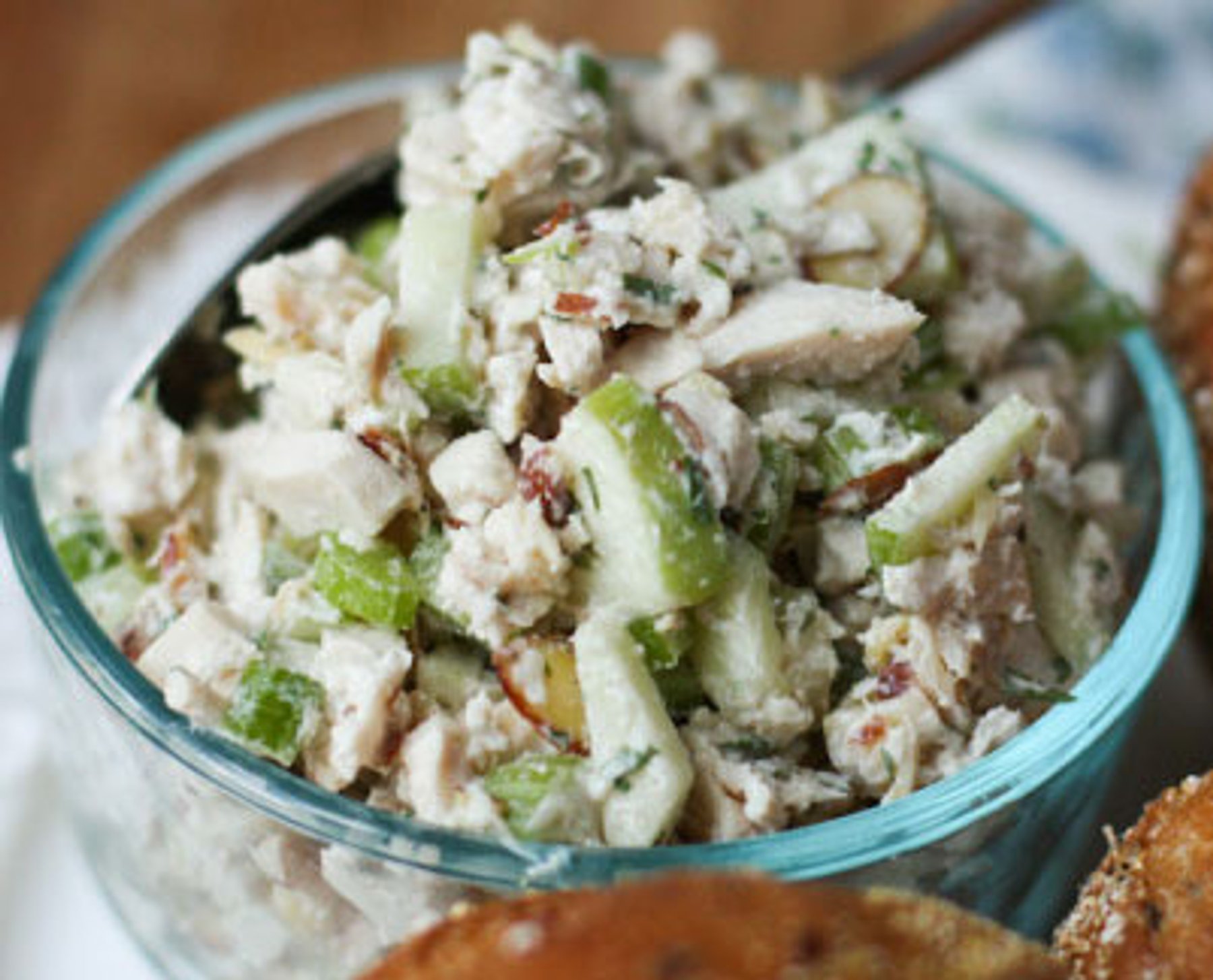 This particular chicken salad was initially inspired by a fresh chicken salad I always bought at my nearby supermarket deli which was made using tarragon along with sliced up almonds. I included some additional crunch as well as seasonal taste by adding cut Granny Smith apples with the salad.