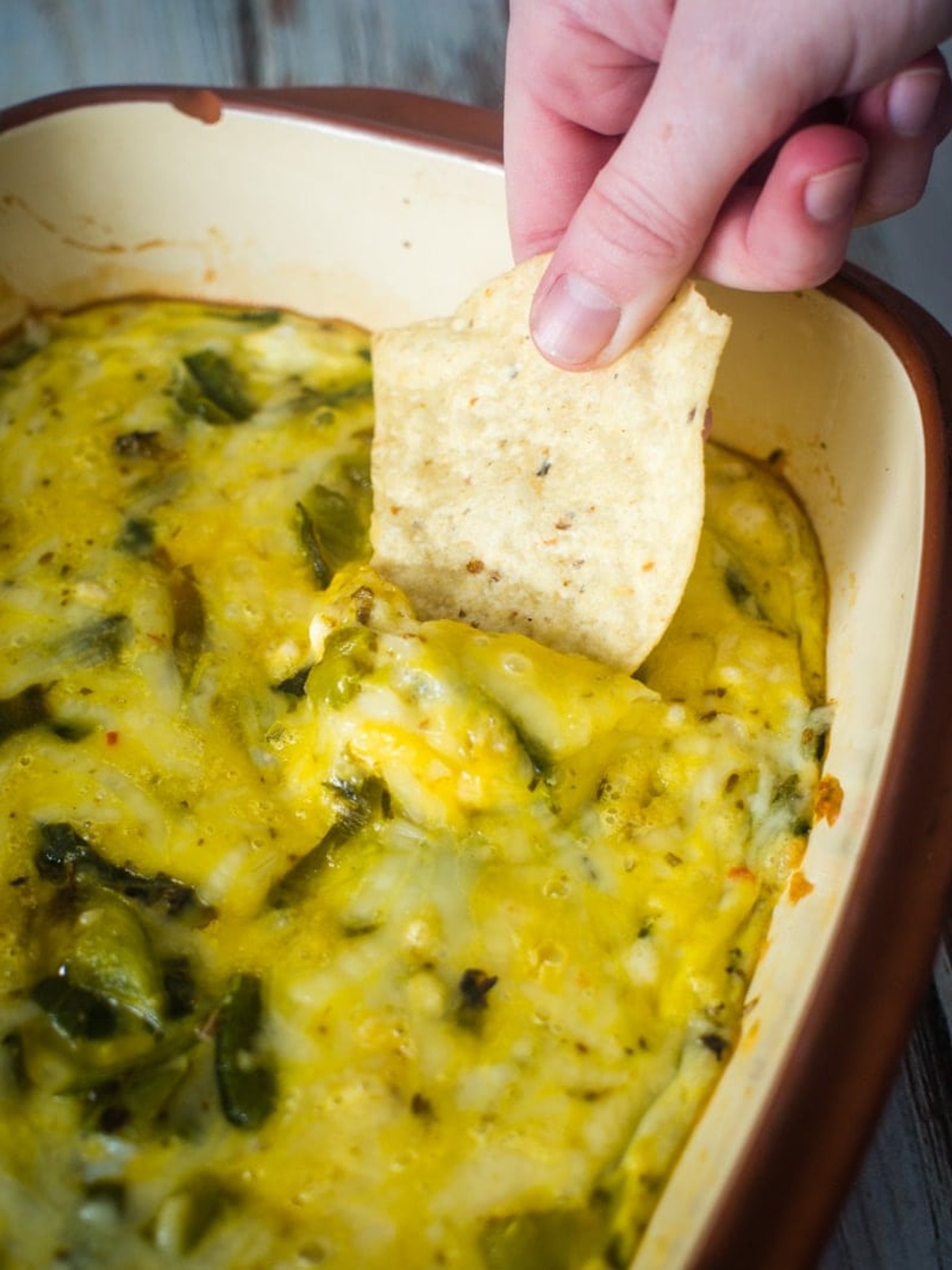 Chile Rellenos Casserole - This easy casserole is made with fresh chile peppers and is perfect for dipping tortilla chips and eating while watching football.
