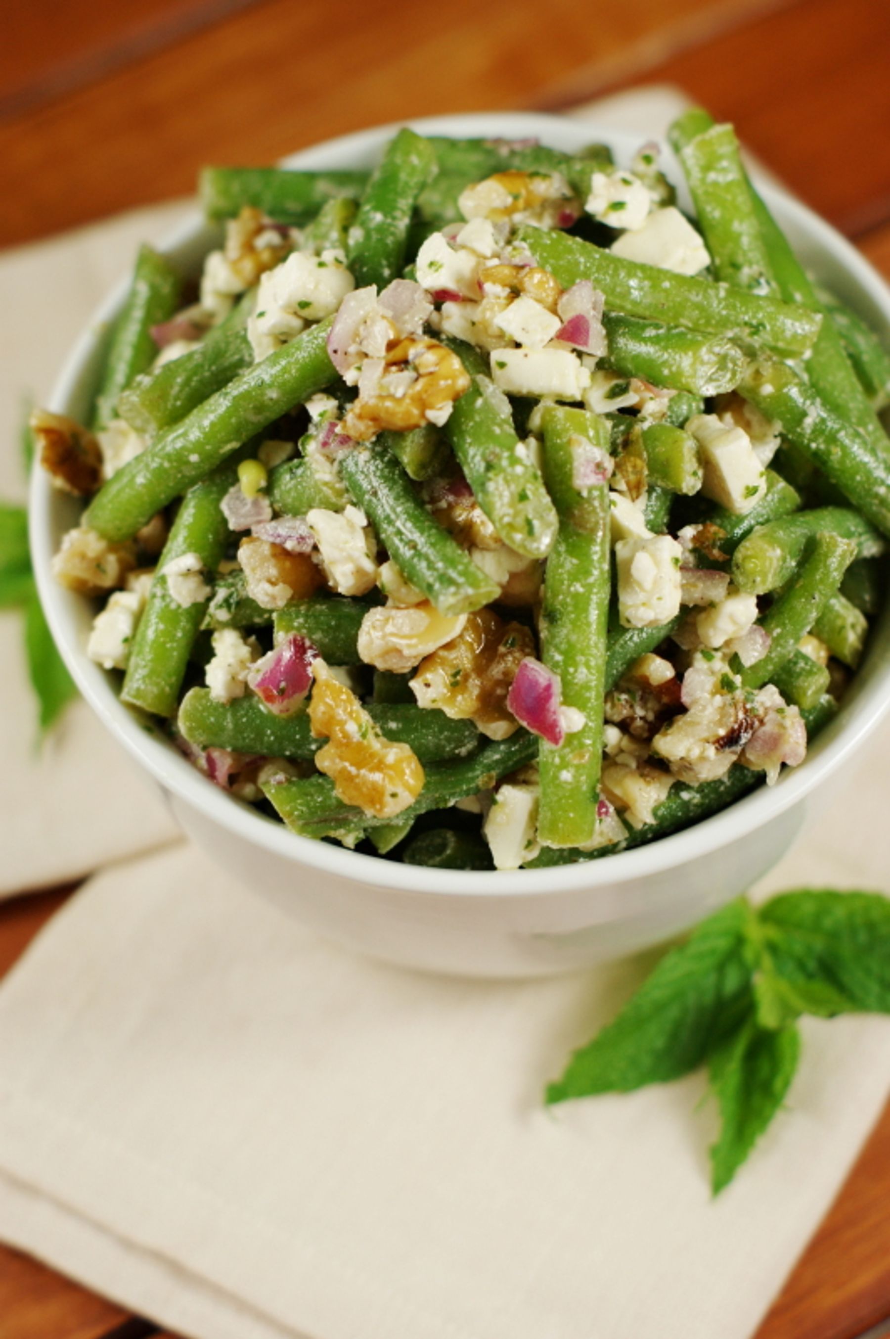 Fresh Green Bean, Walnut, and Feta Cheese Salad dressed with olive oil and fresh mint vinaigrette. It may sound bizarre, but it's one amazingly delicious flavor combination!