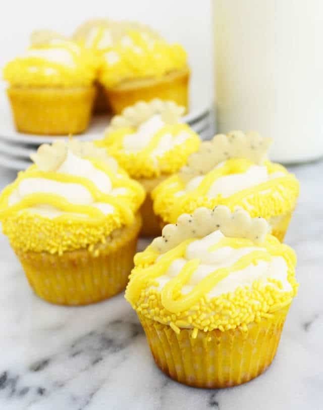 These light and fluffy lemon scented cupcakes are filled with a bright, tart lemon curd and topped with a rich, creamy vanilla frosting.