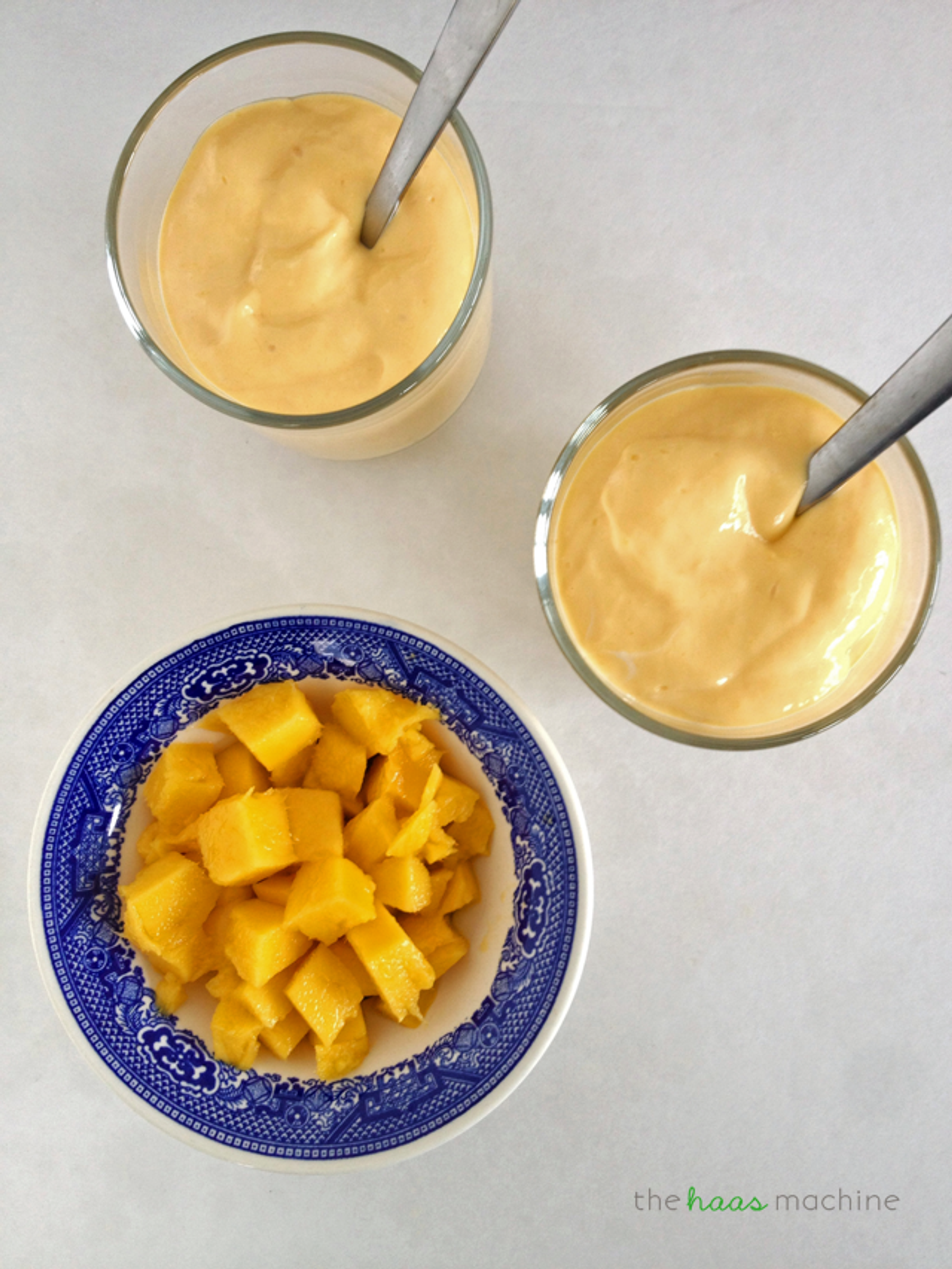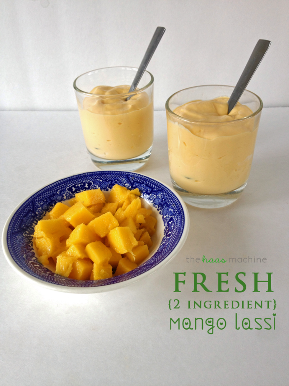 Cut the mango into bite-sized pieces. Blend with the yogurt & add milk if you'd like (I used Greek yogurt, so it was thick enough to eat with a spoon!).