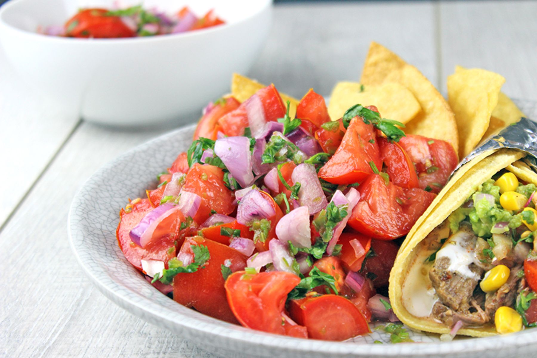 Fresh Pico de Gallo Salad (not salsa!) is naturally fat free & makes an amazing side dish to your favorite Mexican meal! Just 5 ingredients!