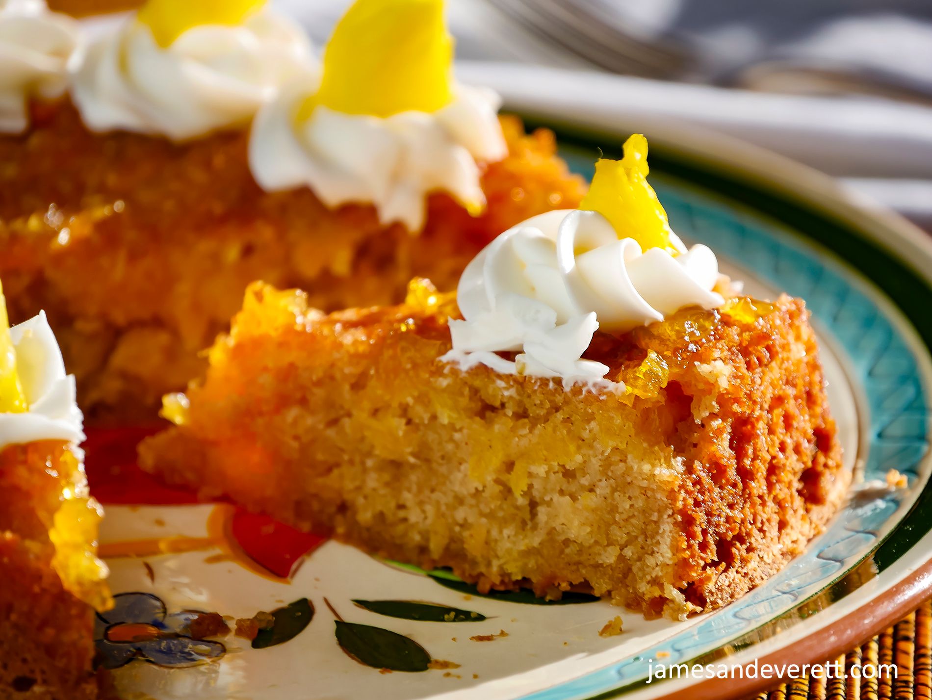Dense moist buttery cake make with fresh pineapple, topped with a spiced rum brown sugar pineapple marmalade. A taste of tropical sunshine in every bite.
