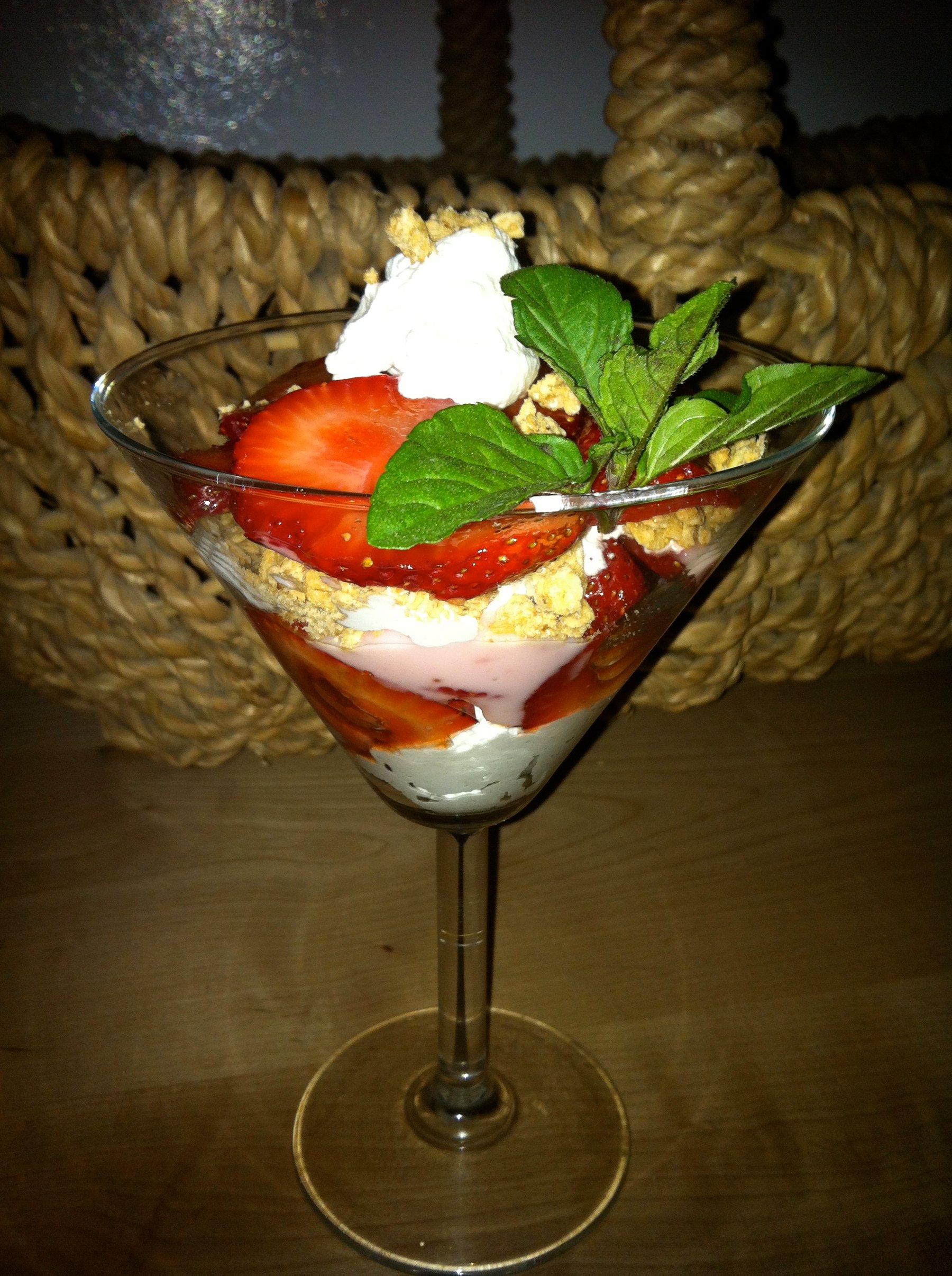 In some nice see through glasses ( we used martini glasses last night), layer the honey yogurt ( or cream),...
