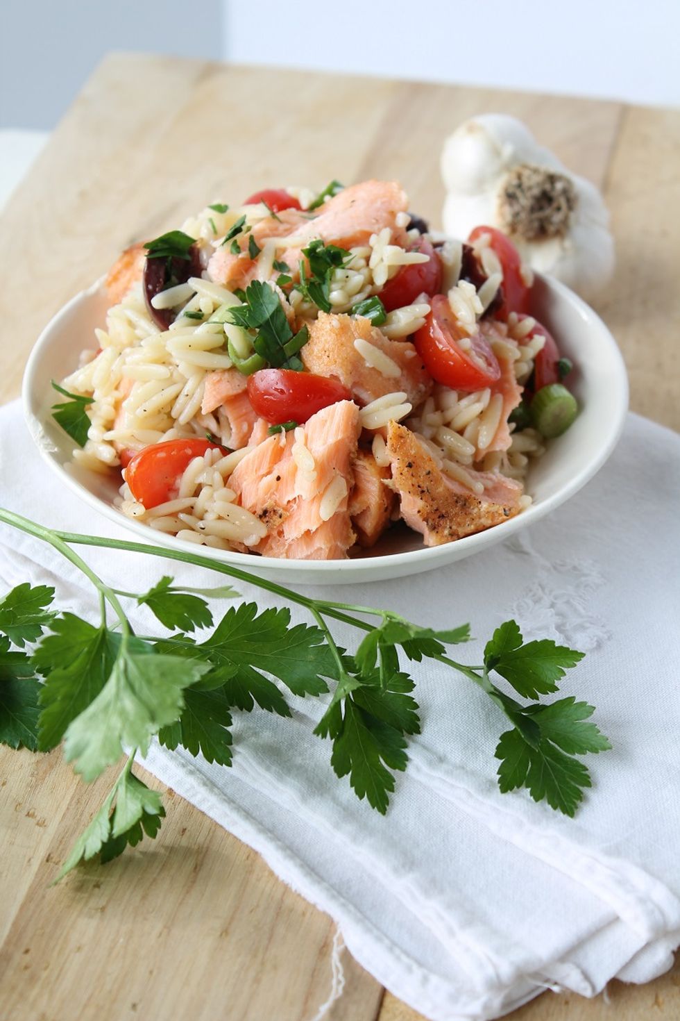 Longing for spring? Satisfy that craving with Fresh Tomato, Salmon and Kalamata Orzo! Refreshing, light, quick to throw together and packed with protein!