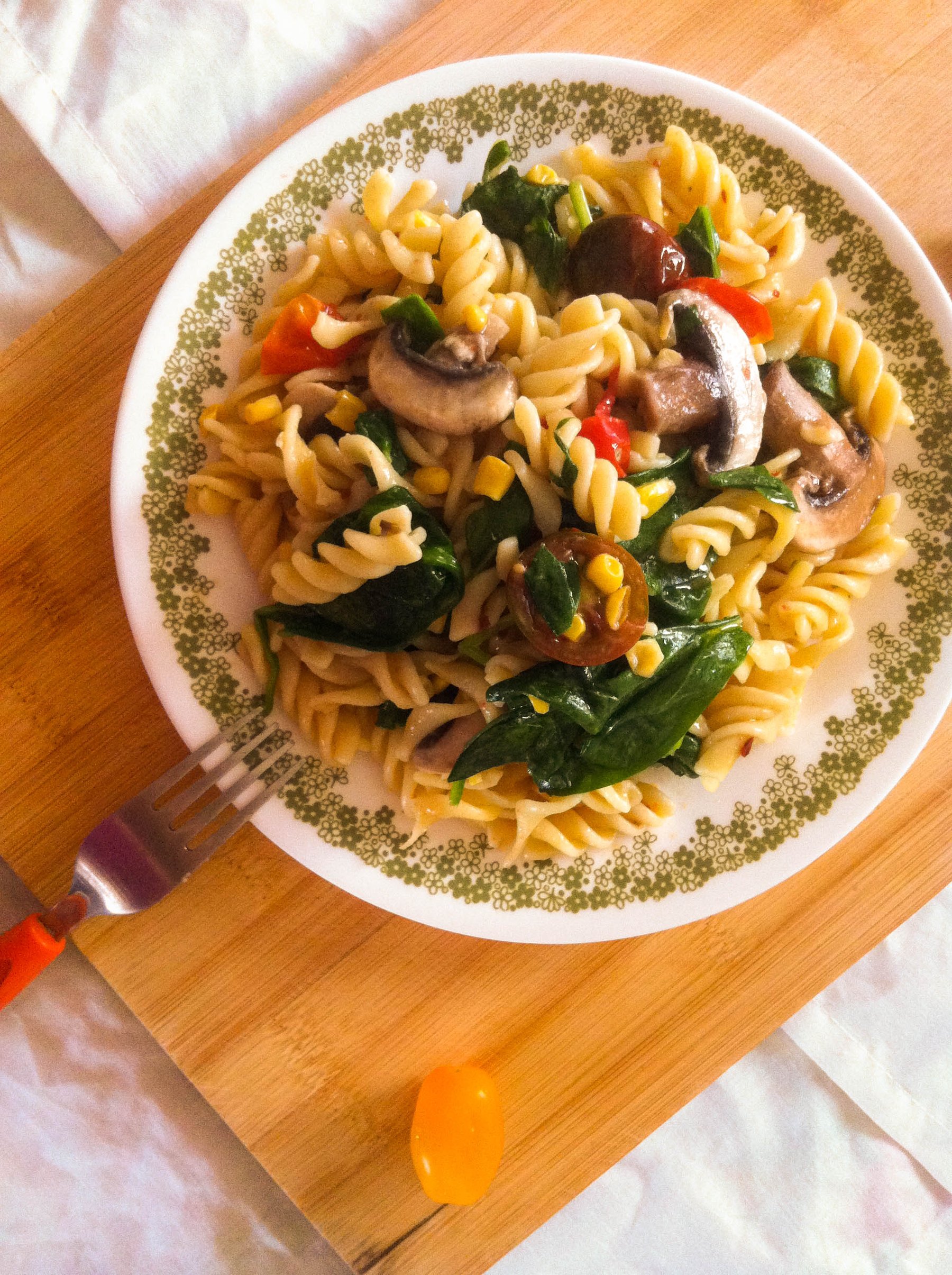 Spicy and garlicky pasta cooked with spinach, sweet corn, sliced mushrooms, and grape tomatoes for a simple yet delicious meal for two. With just a few ingredients, this dish is healthy and refreshing, perfect for dinner after a long day at work or school.