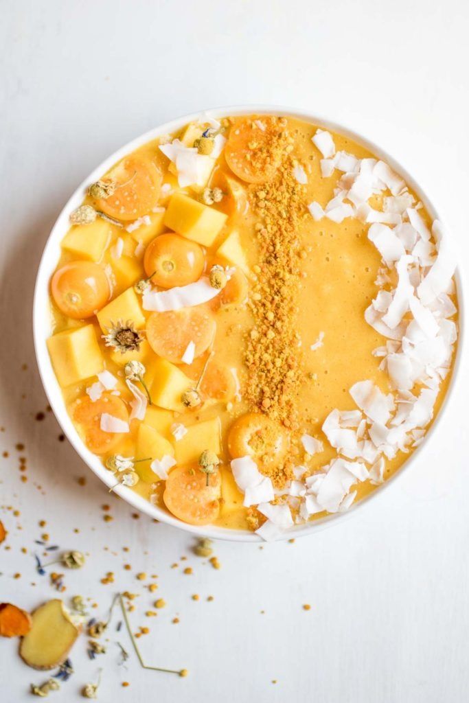 A fresh turmeric smoothie bowl loaded with cauliflower, mango, lemon, orange, and a few other superfood ingredients to help you beat those seasonal allergies.