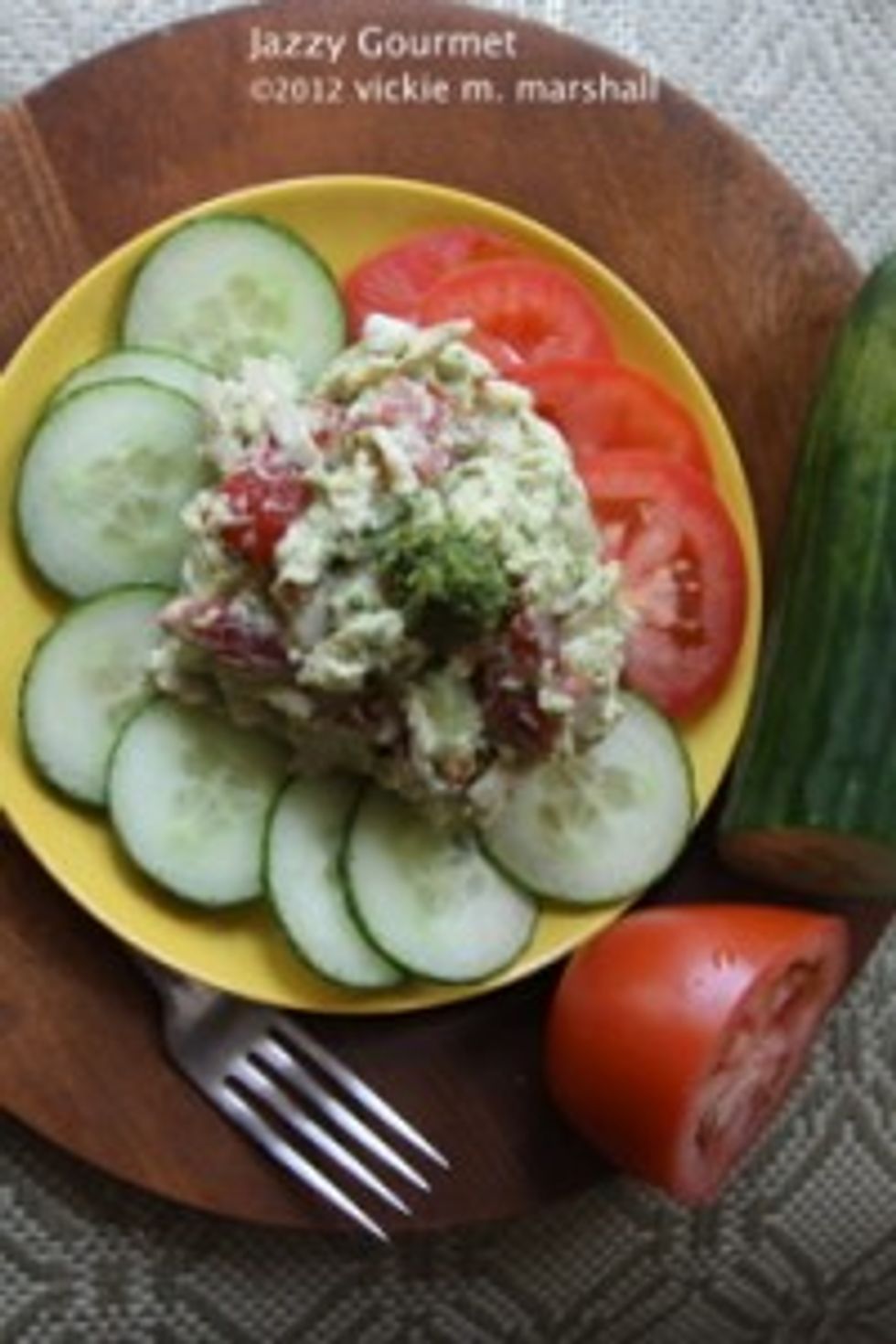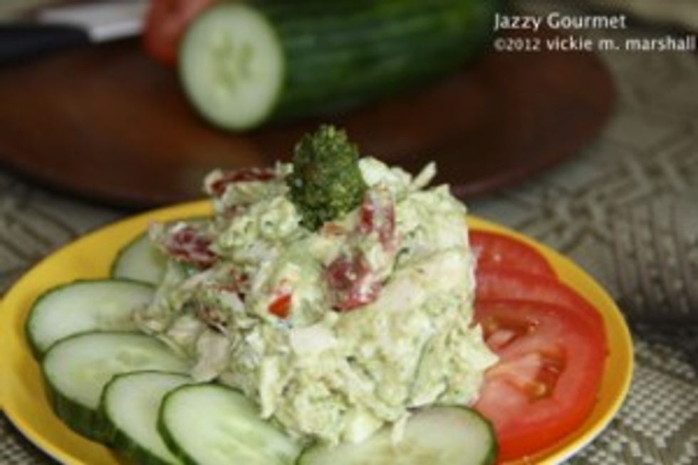 Tasty chicken salad can be made with ingredients found in the fridge, including pesto, cucumber, fresh mozzarella, and Miracle Whip.