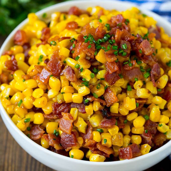This fried corn is cooked with bacon and chives until golden brown and caramelized. The ultimate easy summer side dish that pairs well with grilled meats, fish and hamburgers. A Southern classic that never goes out of style!
