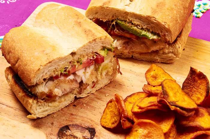 Fried fish sandwich flavor boosted with chipotle mayonnaise. Topped with tomato, avocado and bean sprouts. A favorite at our photographer's Bay Area Cafe. (Sandwich de pescado frito