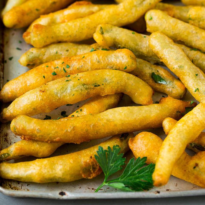 These fried green beans are beer battered string beans deep fried to golden brown perfection. Serve with ranch dip for a unique and unexpected appetizer!