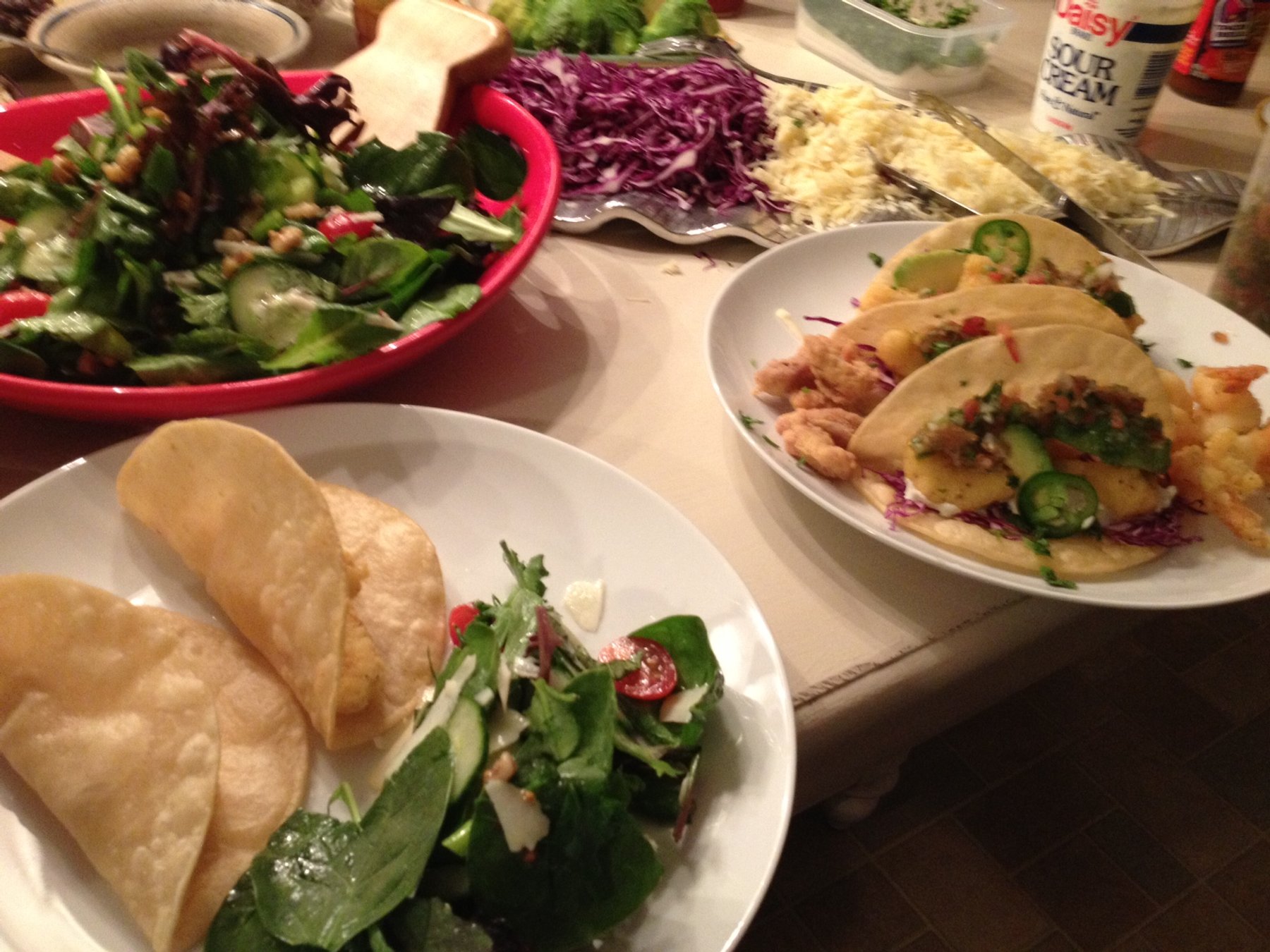 Put other condiments out along with tortillas, fish, sour cream sauce, and tomato salsa and allow guests to assemble their own tacos. Suggest serving salad alongside.