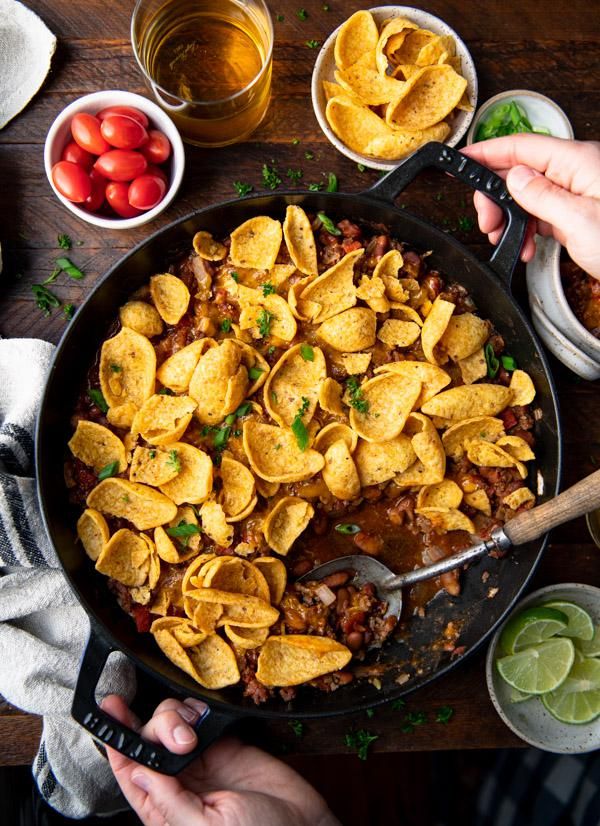 A cozy chili cheese casserole topped with crunchy corn chips! This one-skillet Frito Pie comes together with about 15 minutes of prep for a family-friendly, easy dinner recipe any night of the week. Serve it with corn muffins or 3-ingredient biscuits, a simple green salad, or roasted broccoli for a delicious meal!