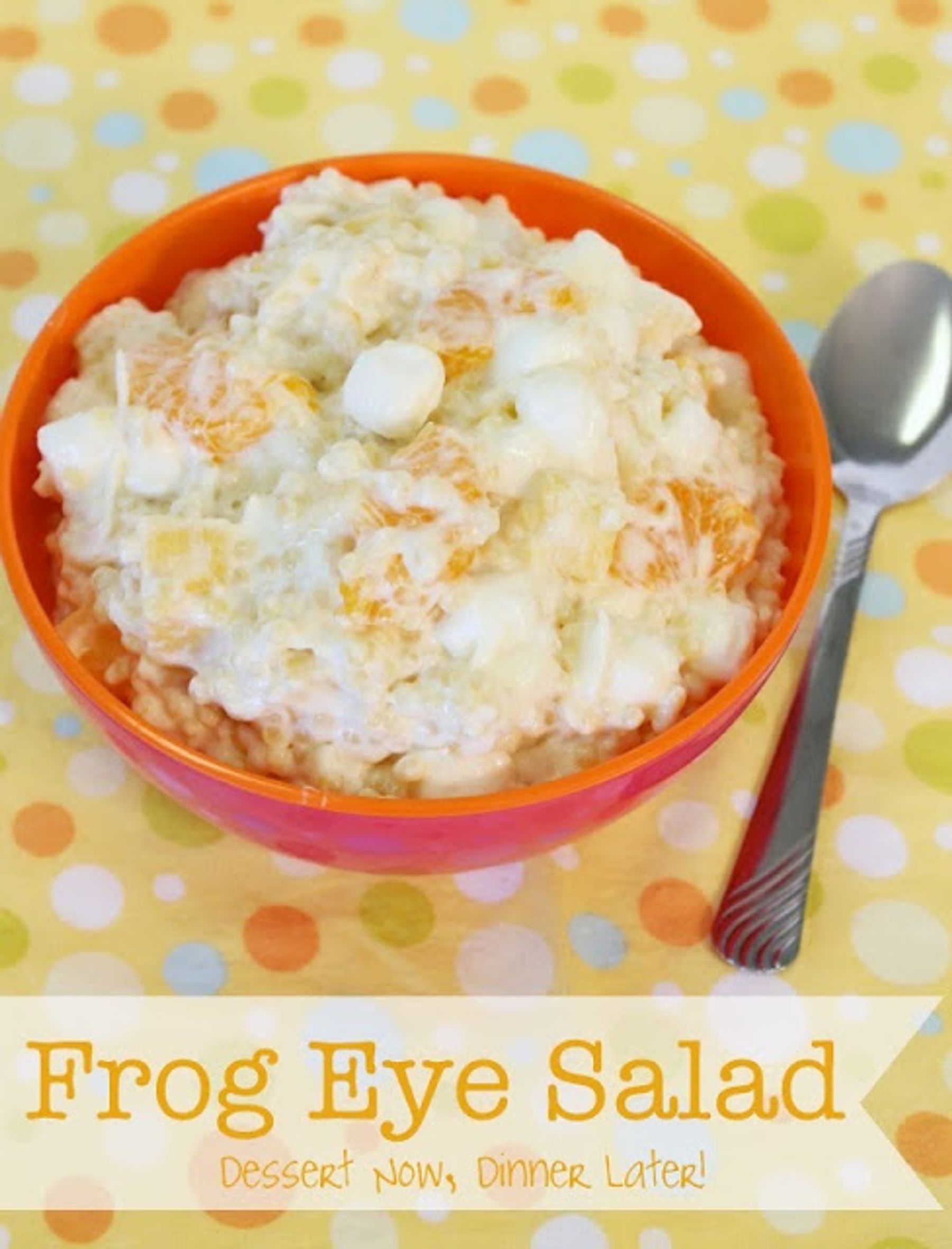 Acini Di Pepe (tiny round pasta), fruit, marshmallows, pudding & whipped cream all wrapped into one sweet salad. A crowd favorite!